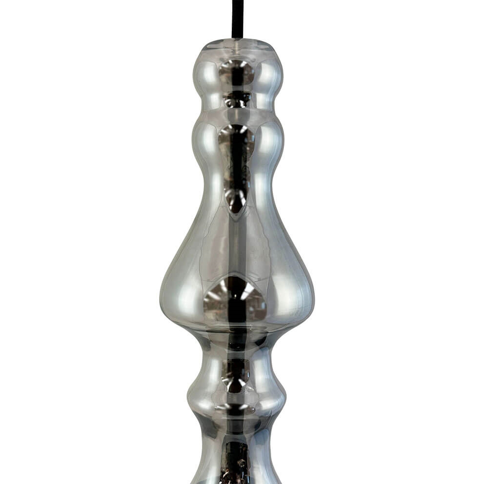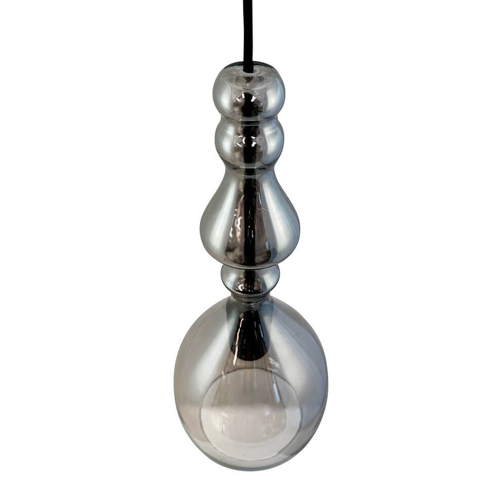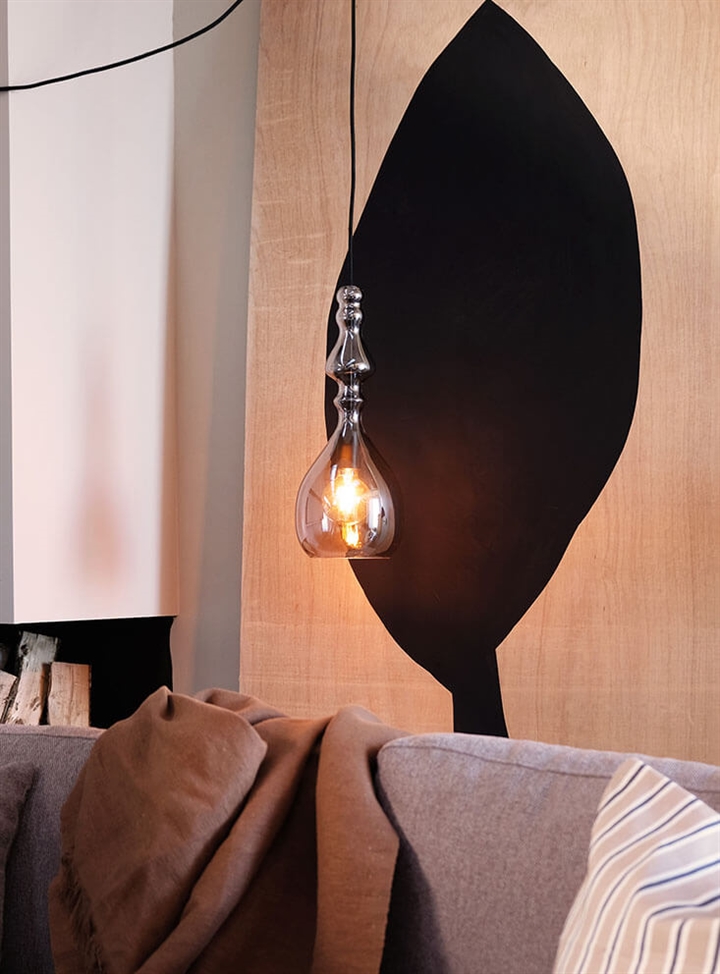 Die Glaspendelleuchte hat eine innere Aufhängung aus Metall und eine Deckenrosette ist im Lieferumfang enthalten. Die Pendelleuchte ist in den Farben Smoke und Amber erhältlich.