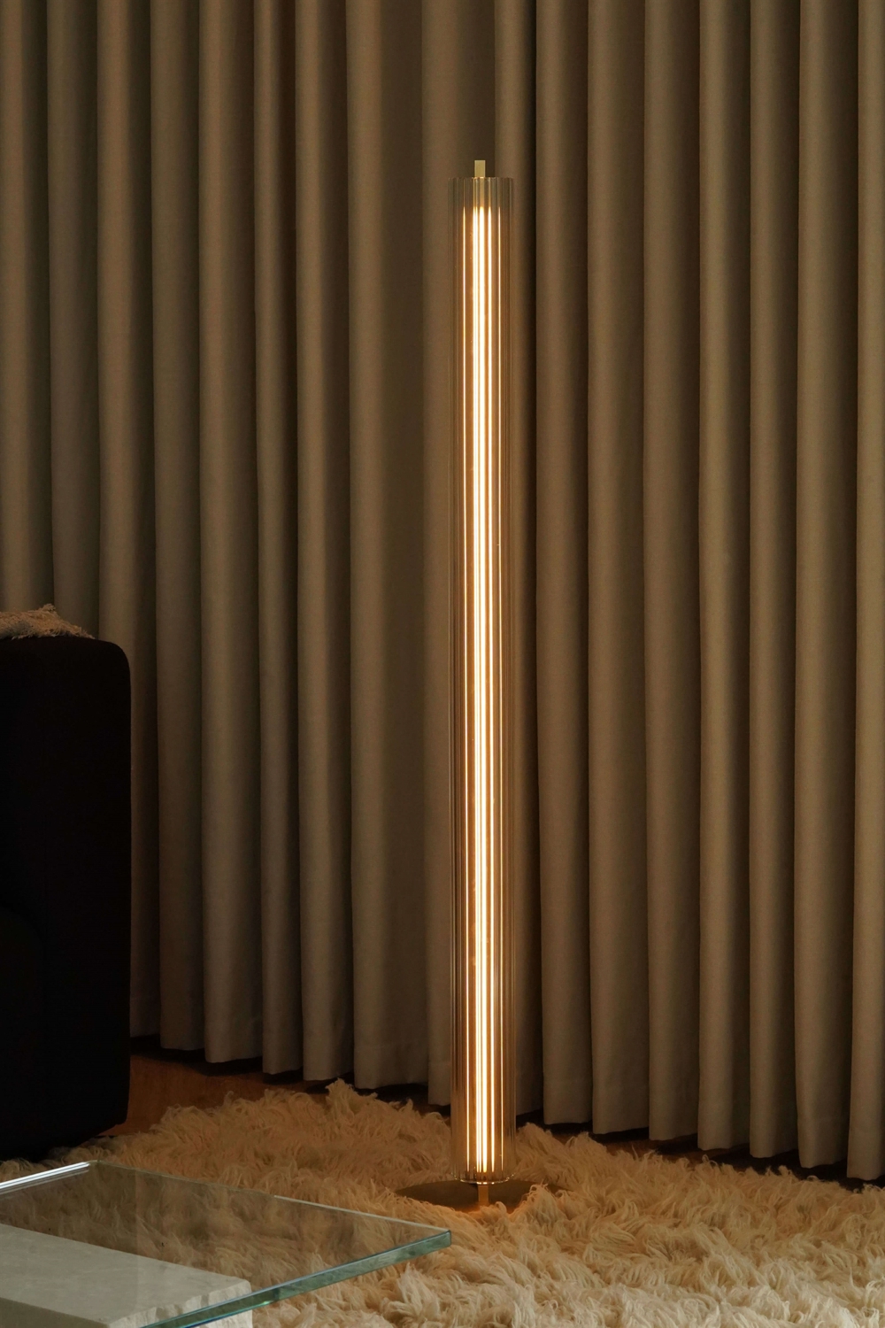 Die integrierte LED-Lichtquelle ist stufenweise dimmbar über eine dezente Touch-Funktion an der Oberseite, sodass das Licht einfach auf 100 %, 40 % oder 10 % angepasst werden kann, um die gewünschte Atmosphäre zu schaffen. Der Schirm mit klarem, vertikal geriffeltem Glas reflektiert das Licht wunderschön, während die Basis mit zeitlosem Finish in dark coffee oder Messing der Stehlampe einen exklusiven Ausdruck verleiht.