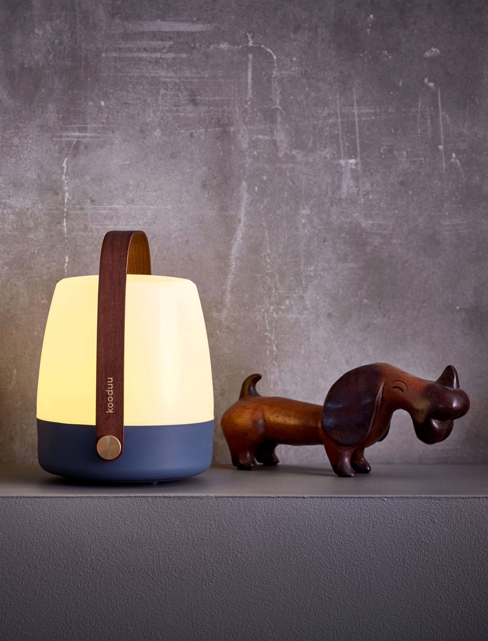 Kooduu lampe zieht in jeder Einrichtung die Blicke auf sich. Lite-up hat einen Körper aus weißem PE mit Soft-Touch. Der Griff besteht aus dunklem Holz.