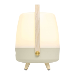 Kooduu Lampe zieht in jeder Einrichtung die Blicke auf sich. Lite-up Play hat einen Körper aus weißem PE und einen Griff aus dunklem Holz. Die Lautsprecherlampe kann sowohl drinnen als auch draußen verwendet werden, sollte aber nach Gebrauch wieder hereingeholt werden.