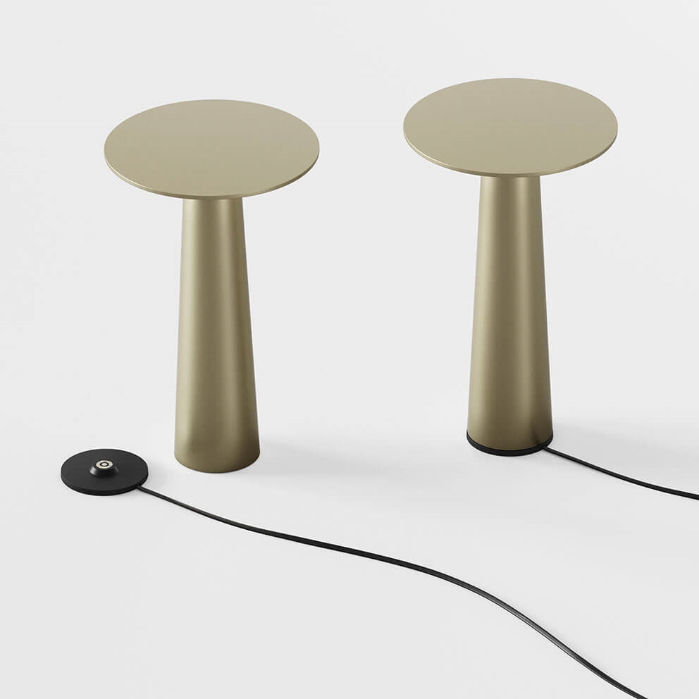 Die beliebte Akkuleuchte Lix mit goldener Oberfläche ist leicht mitzunehmen und kann mit einer integrierten, dimmbaren LED-Lichtquelle von warmweiß bei 2700K bis zum gemütlichen Kerzenschein bei 1800K an jede Stimmung angepasst werden. Die tragbare Tischleuchte kann je nach gewählter Dimmung zwischen 5 und 48 Stunden leuchten, bevor sie auf die mitgelieferte Ladestation gestellt und erneut aufgeladen werden muss.