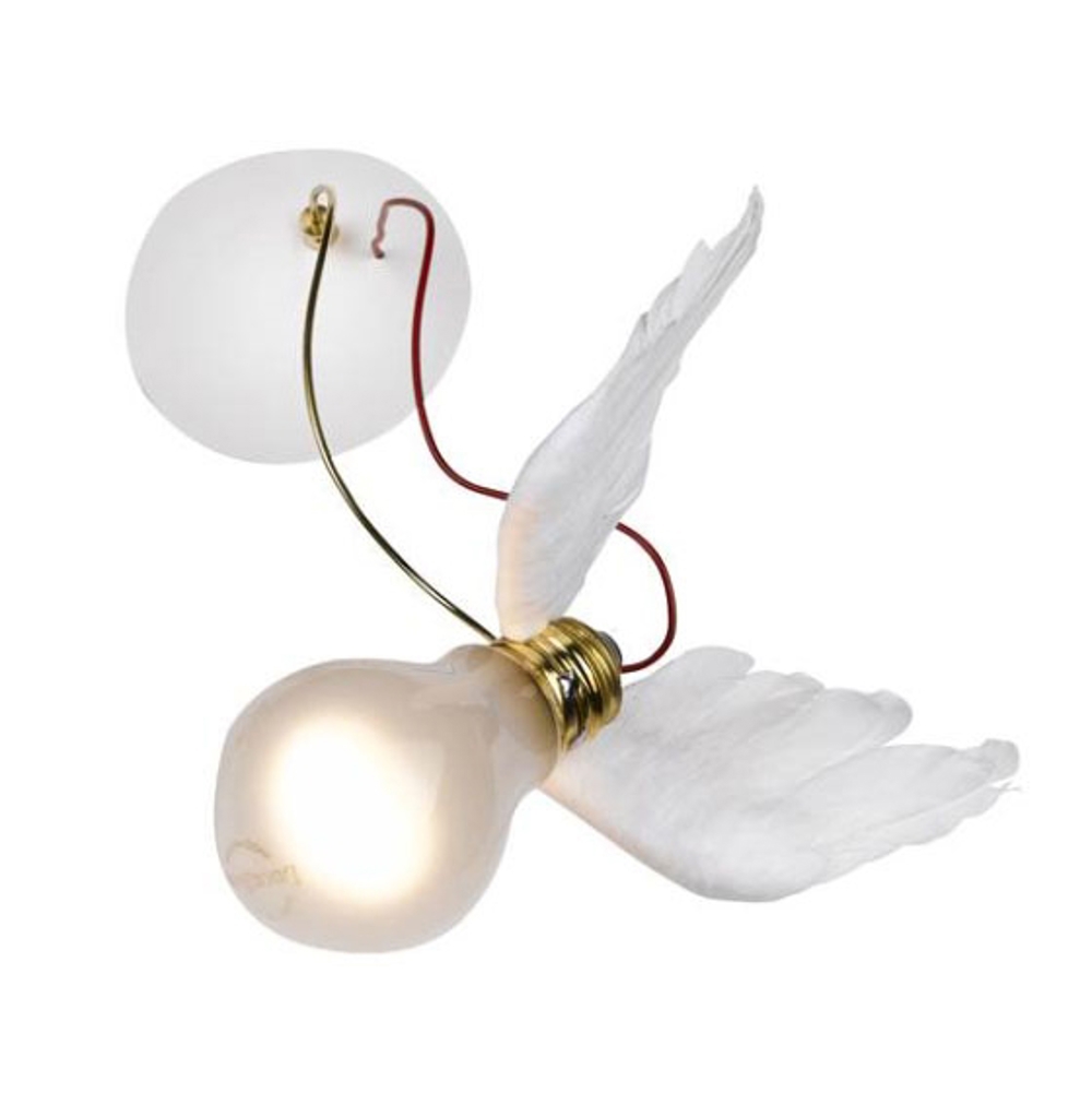 Ingo Maurer Lucellino ist die Lampe für diejenigen, die wirklich etwas Einzigartiges wollen - Glas, Messing, Kunststoff und echte Gänsefedern, die wie kleine Flügel angeordnet sind, entworfen von Ingo Maurer im Jahr 1992. Lucellino hat Flügel, die sie fast in der Luft schweben lassen.