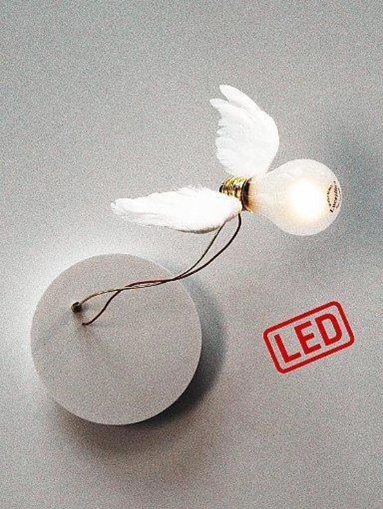 Ingo Maurer Lucellino ist die Lampe für diejenigen, die wirklich etwas Einzigartiges wollen - Glas, Messing, Kunststoff und echte Gänsefedern, die wie kleine Flügel angeordnet sind, entworfen von Ingo Maurer im Jahr 1992. Lucellino hat Flügel, die sie fast in der Luft schweben lassen.