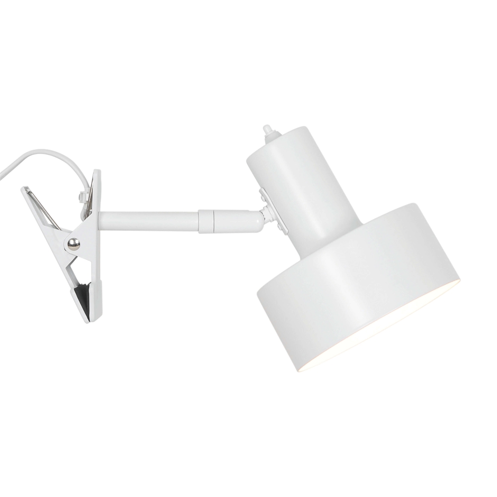 Die Klemmleuchte Matis hat ein minimalistisches Design, das sich gut in viele Einrichtungsstile einfügt. Die Lampe ist dank ihrer Klemme einfach zu platzieren und zu bewegen und hat einen verstellbaren Lampenkopf, der um 90° gekippt und um 320° gedreht werden kann. Der Klemmspot bietet ein gutes Licht und erzeugt einen schönen Lichteffekt durch die kleinen Löcher oben auf dem Schirm. Verwenden Sie ihn als Arbeitslicht, Leselampe oder für andere fokussierte Beleuchtung.