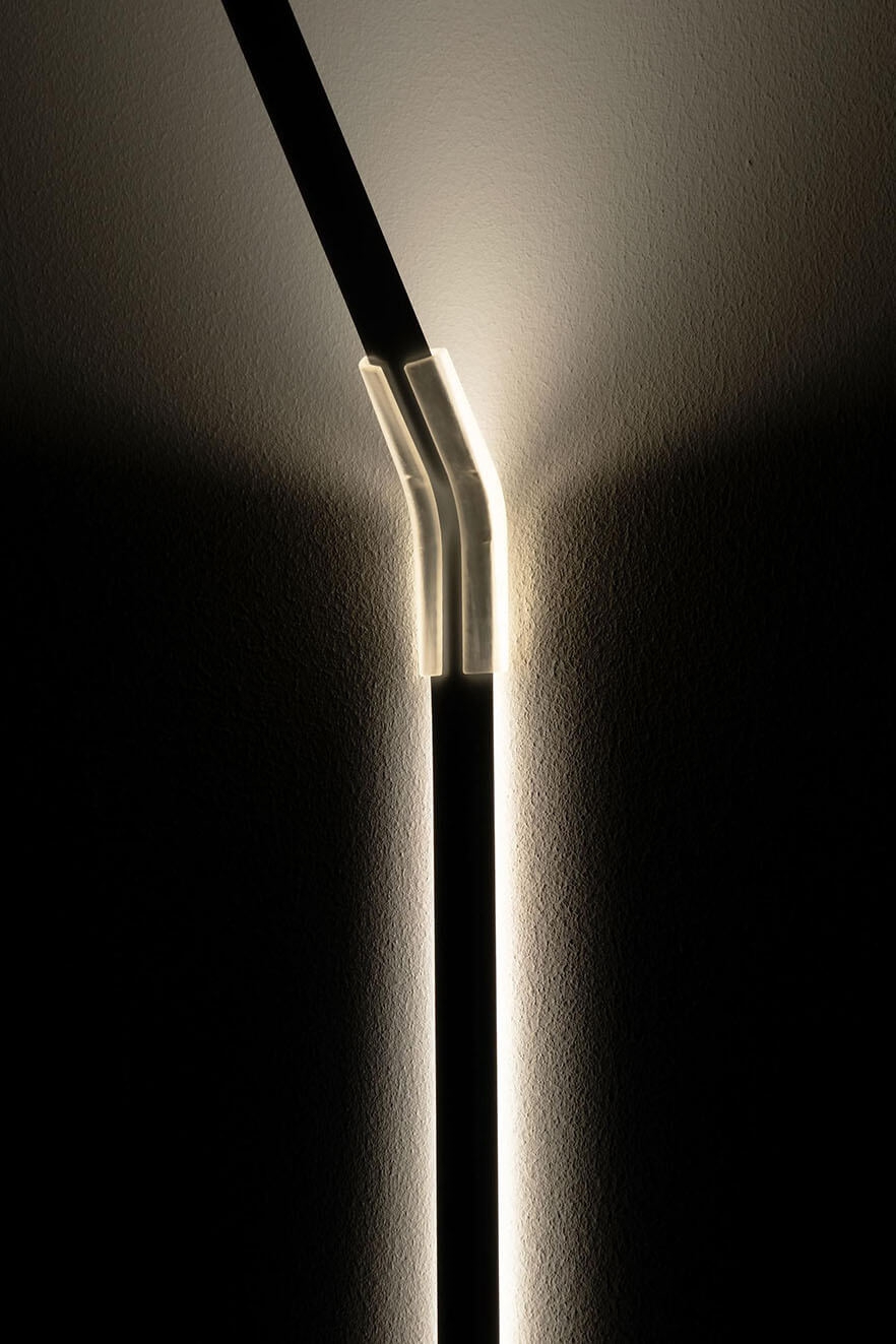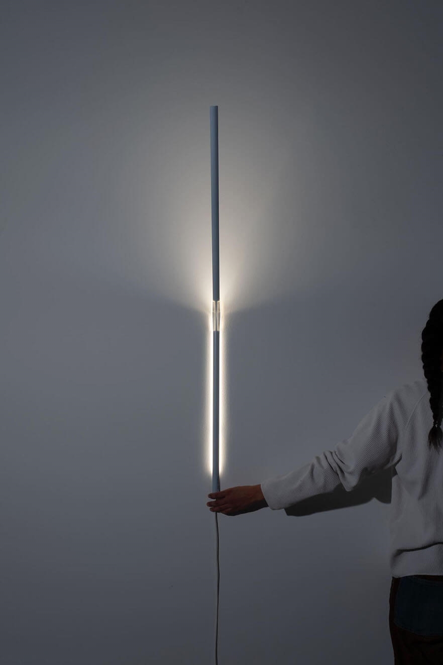 Die Wandleuchte Measure Light kombiniert mit ihrem einzigartigen Design ein klassisches flexibles Metallmaßband mit einem Lichtband, das sich über die gesamte Länge der Lampe erstreckt. Es ist möglich, das Band vorsichtig auf und ab zu bewegen, sodass das Licht von einem dünnen Streifen zu einer indirekten offenen Lichtquelle angepasst werden kann. Die Vorderseite des Maßbandarmatur ist weiß und hat das Lichtband auf der Rückseite integriert, sodass das Licht zur Wand gerichtet ist. Die Lampe wird mit der mitgelieferten transparenten Halterung an der Wand montiert.