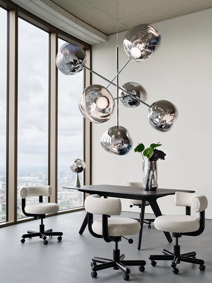 Die Melt-Serie wurde in Zusammenarbeit zwischen Tom Dixon und dem schwedischen Designkollektiv Front mit dem Wunsch geschaffen, ein unvollkommenes, organisches und naturalistisches Lichtobjekt zu kreieren. Der Ausdruck der Serie ist inspiriert von geschmolzenem Glas, dem Inneren eines schmelzenden Gletschers und Bildern des tiefen Raums.