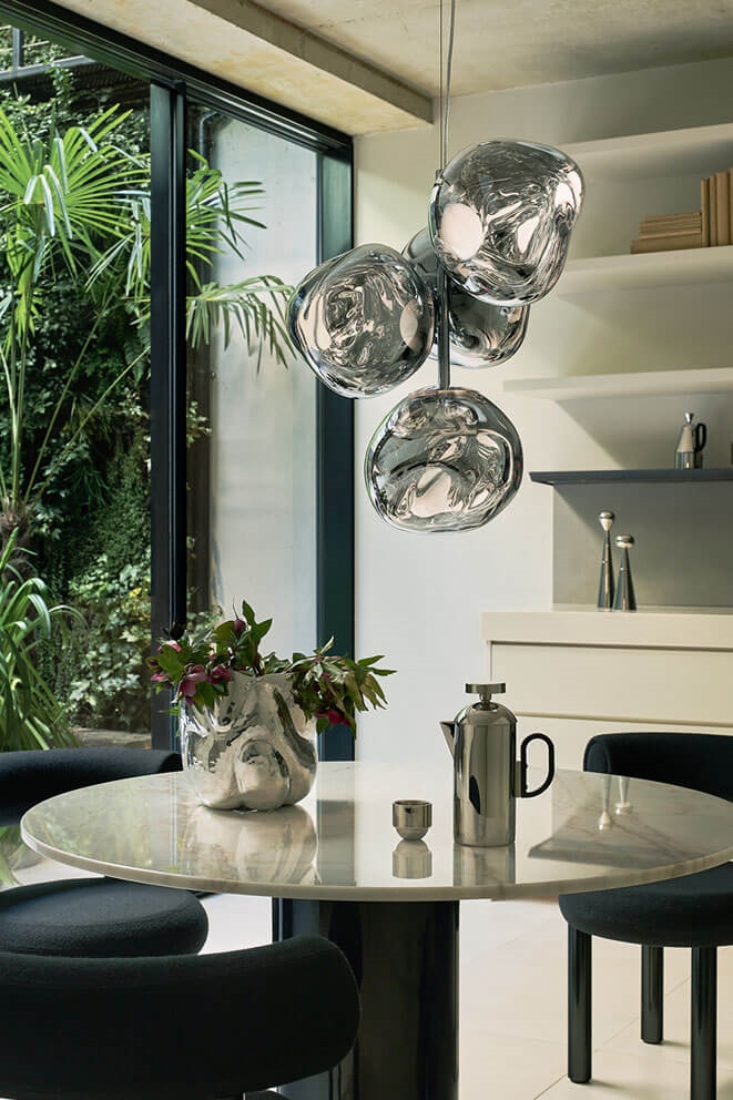 Die Melt-Serie wurde in Zusammenarbeit zwischen Tom Dixon und dem schwedischen Designkollektiv Front mit dem Wunsch geschaffen, ein unvollkommenes, organisches und naturalistisches Lichtobjekt zu kreieren. Der Ausdruck der Serie ist inspiriert von geschmolzenem Glas, dem Inneren eines schmelzenden Gletschers und Bildern des tiefen Raums.