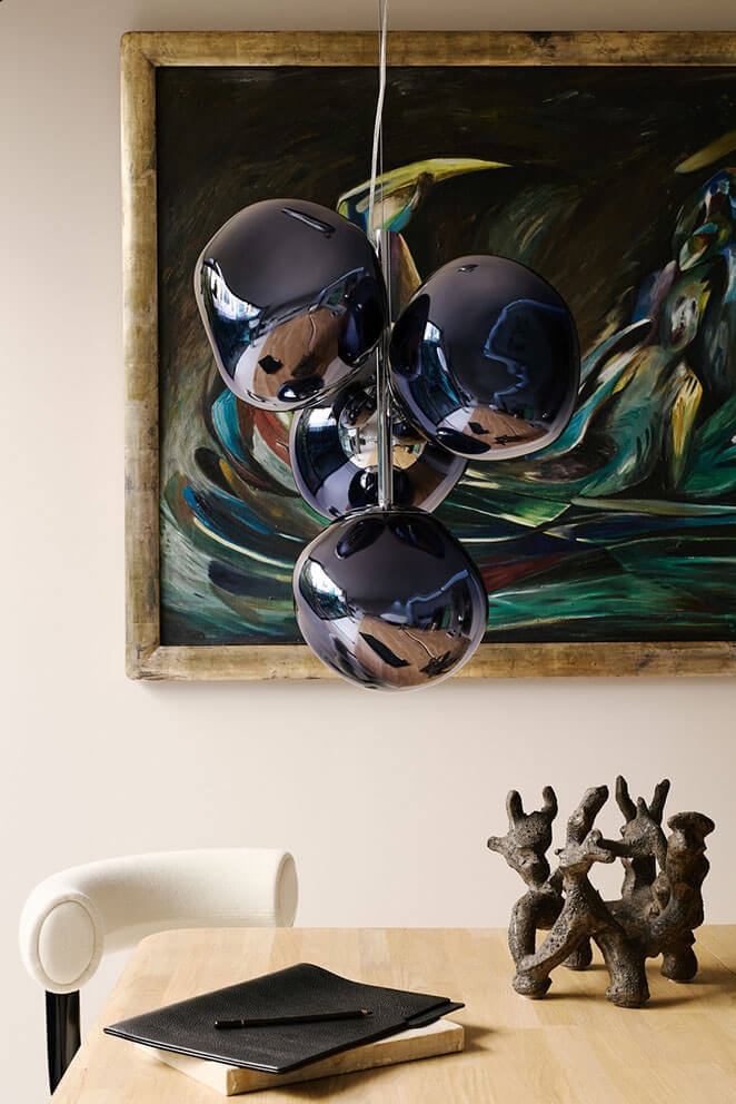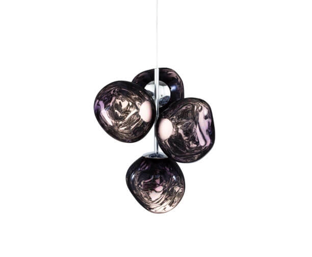 Der Melt mini Kronleuchter ermöglicht es auch kleineren Räumen, von einem Kronleuchter zu profitieren. Die kompakte Mini-Version der Kronleuchter von Tom Dixon verfügt über vier metallisierte, unvollkommene Kugelschirme mit Spiegeleffekt, die so montiert sind, dass sie eine kleine Gruppe bilden. Der Kronleuchter passt gut in viele moderne Einrichtungen.