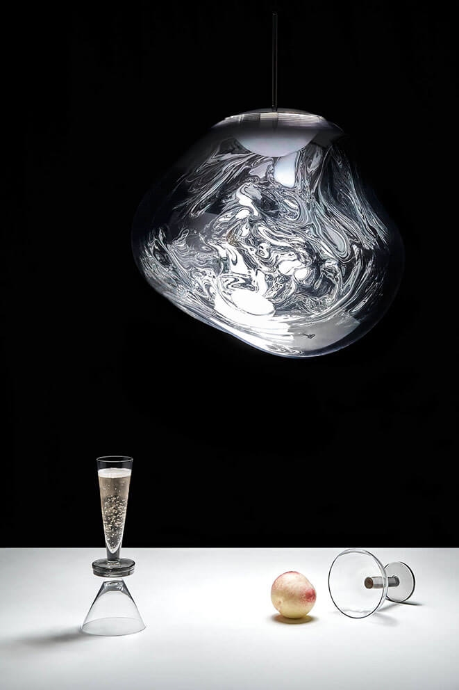 Die Melt-Serie wurde in Zusammenarbeit zwischen Tom Dixon und dem schwedischen Designkollektiv Front mit dem Wunsch geschaffen, ein unvollkommenes, organisches und naturalistisches Lichtobjekt zu kreieren. Der Ausdruck der Serie ist inspiriert von geschmolzenem Glas, dem Inneren eines schmelzenden Gletschers und Bildern des tiefen Raums.