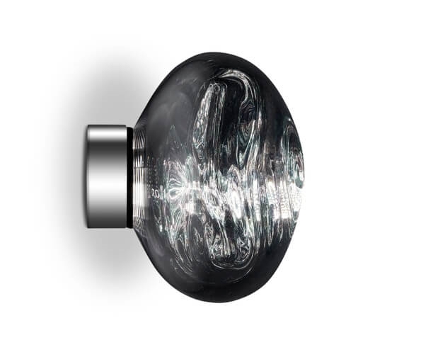 Melt Surface mini kann sowohl als Wandlampe als auch als Deckenleuchte verwendet werden und verleiht mit einer speziellen Metallisierung dem unvollkommenen Schirm einen Glaseffekt, wenn sie eingeschaltet ist, und ein Spiegel-Finish, wenn sie ausgeschaltet ist.