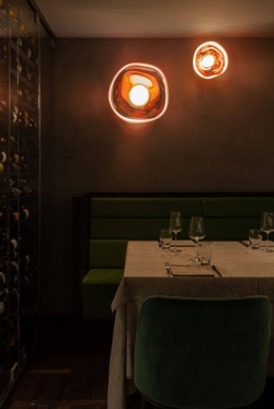 Melt Surface mini kann sowohl als Wandlampe als auch als Deckenleuchte verwendet werden und verleiht mit einer speziellen Metallisierung dem unperfekten Schirm einen Glaseffekt, wenn sie eingeschaltet ist, und eine Spiegeloberfläche, wenn sie ausgeschaltet ist.
