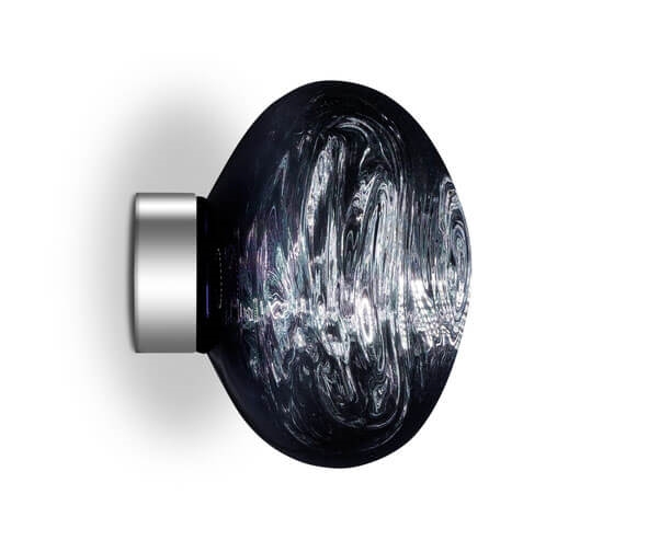 Melt Surface mini kann sowohl als Wandlampe als auch als Deckenleuchte verwendet werden und verleiht mit einer speziellen Metallisierung dem unvollkommenen Schirm einen Glaseffekt, wenn sie eingeschaltet ist, und eine Spiegeloberfläche, wenn sie ausgeschaltet ist.