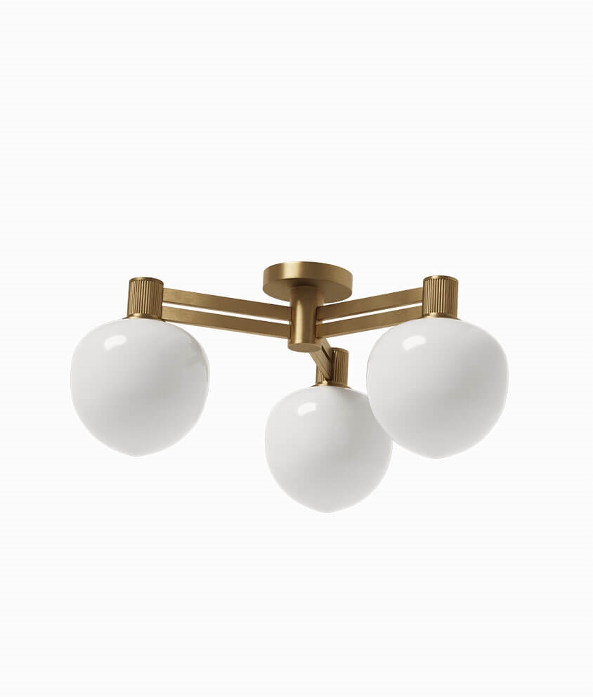 Die Deckenleuchte besteht aus einem 3-lagigen Opalglas, das schön mit Messingdetails kombiniert wird. Das dicke opale Glas schirmt die Lichtquelle ab, sodass es blendfrei und gleichmäßig im Raum erscheint.