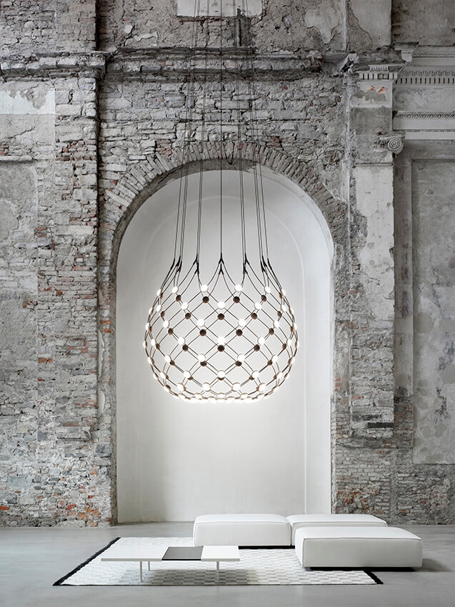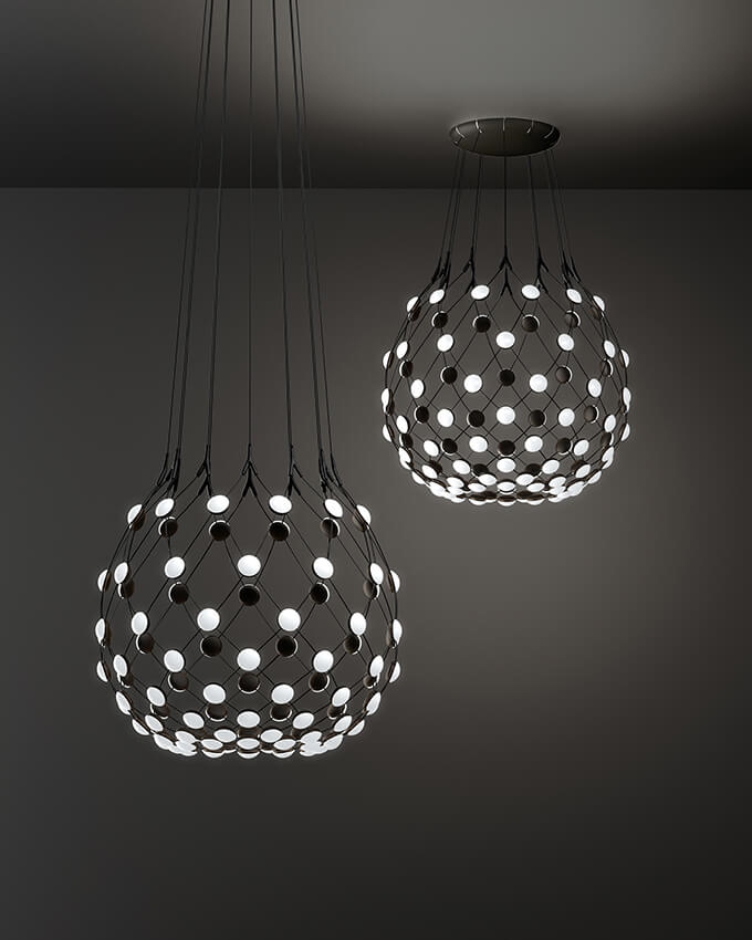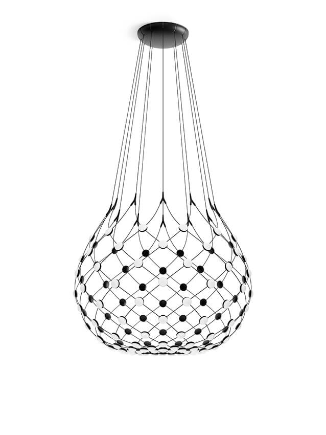 Mesh hat ein einzigartiges Design und erzeugt einen großen theatralischen Effekt, wo immer sie hängt. Aufgrund der Form der Lampe wird eine große Lichtverteilung erreicht. Sie könnte daher ideal über einem Esstisch aufgehängt werden.