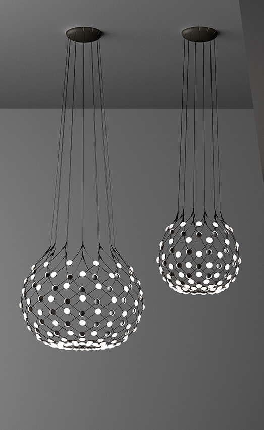 Die elegante Mesh Pendelleuchte erhellt jeden Raum mit ihrer transparenten Struktur und schönen Details. Die Pendelleuchte besteht aus flexiblen Kabeln, die sich um LED-Lichtquellen gruppieren und mit Phasen-Dimmung gedimmt werden.