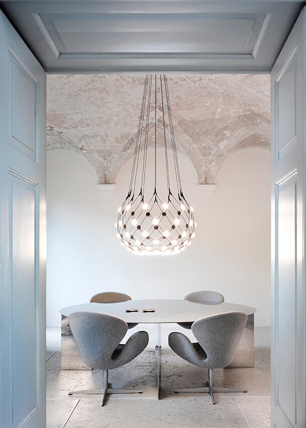 Mesh hat ein einzigartiges Design und erzeugt einen großen theatralischen Effekt, wo immer sie hängt. Aufgrund der Form der Lampe wird eine große Lichtverteilung erreicht. Sie könnte daher ideal über einem Esstisch aufgehängt werden.
