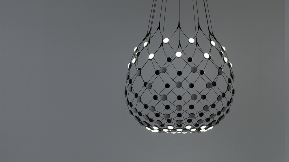 Mesh hat ein einzigartiges Design und erzeugt einen großen theatralischen Effekt, wo immer sie hängt. Aufgrund der Form der Lampe wird das Licht weit verteilt. Sie könnte daher ideal über einem Esstisch aufgehängt werden.