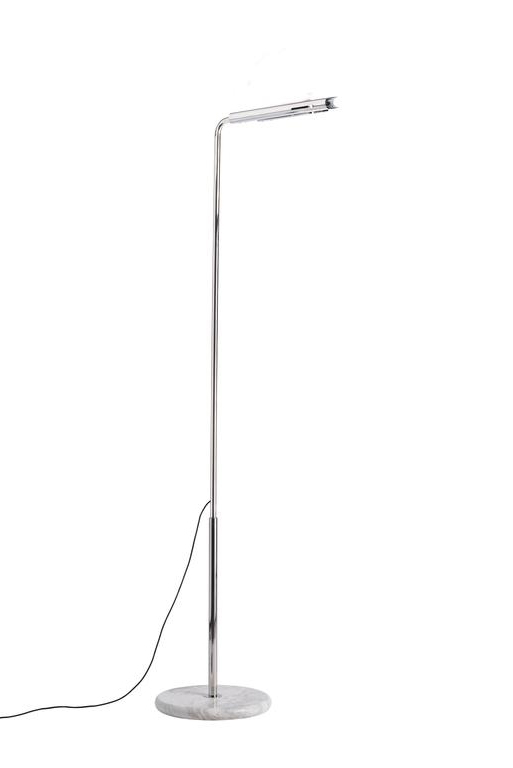 Die schöne Stehlampe hat einen Sockel aus weißem Marmor und einen Ständer aus Chrom und kann über ein Teleskopsystem in der Höhe verstellt werden. Der Schirm aus Aluminium mit chromfarbener Oberfläche kann gekippt werden, um die Lichtausrichtung zu ändern.
