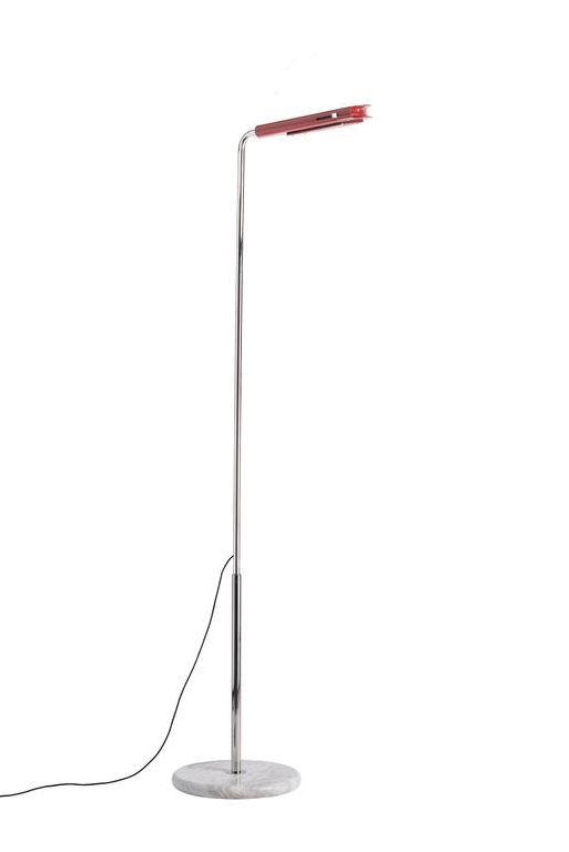 Die schöne Stehlampe hat einen Sockel aus weißem Marmor und einen Ständer mit Chrom-Finish und kann über ein Teleskopsystem in der Höhe verstellt werden. Der Schirm aus farbigem Aluminium ist neigbar, sodass die Lichtausrichtung verändert werden kann.