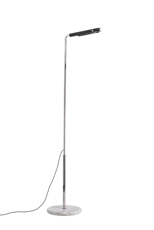 Die schöne Stehlampe hat einen Sockel aus weißem Marmor und einen Ständer mit Chrom-Finish und kann über ein Teleskopsystem in der Höhe verstellt werden. Der Schirm aus farbigem Aluminium ist neigbar, sodass die Lichtausrichtung verändert werden kann.