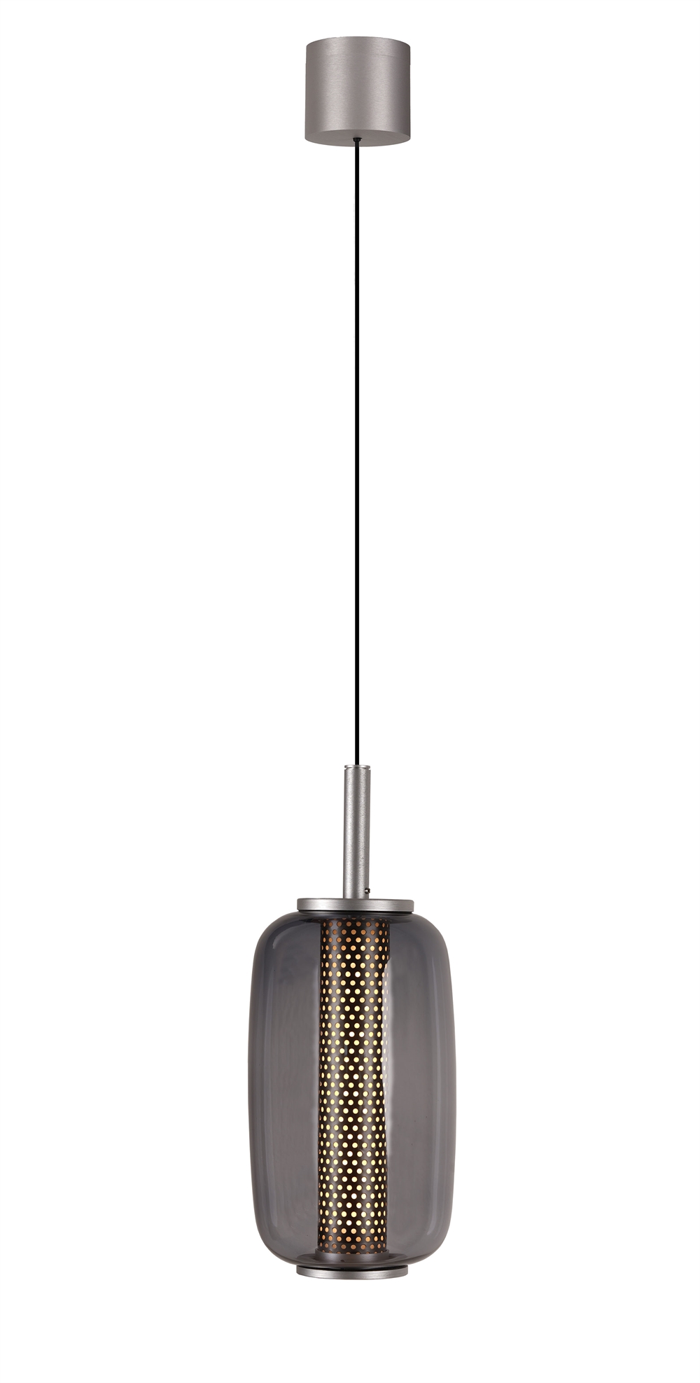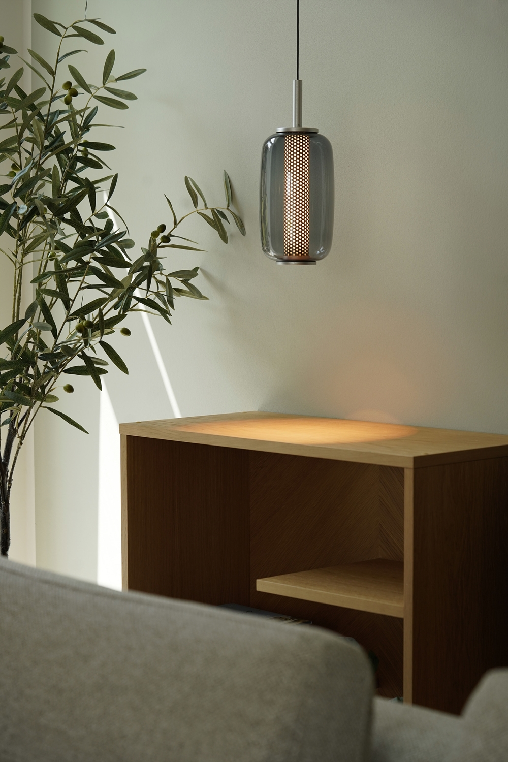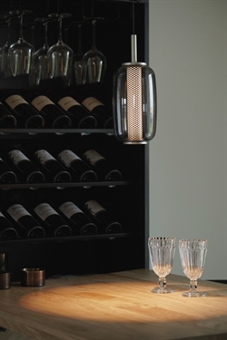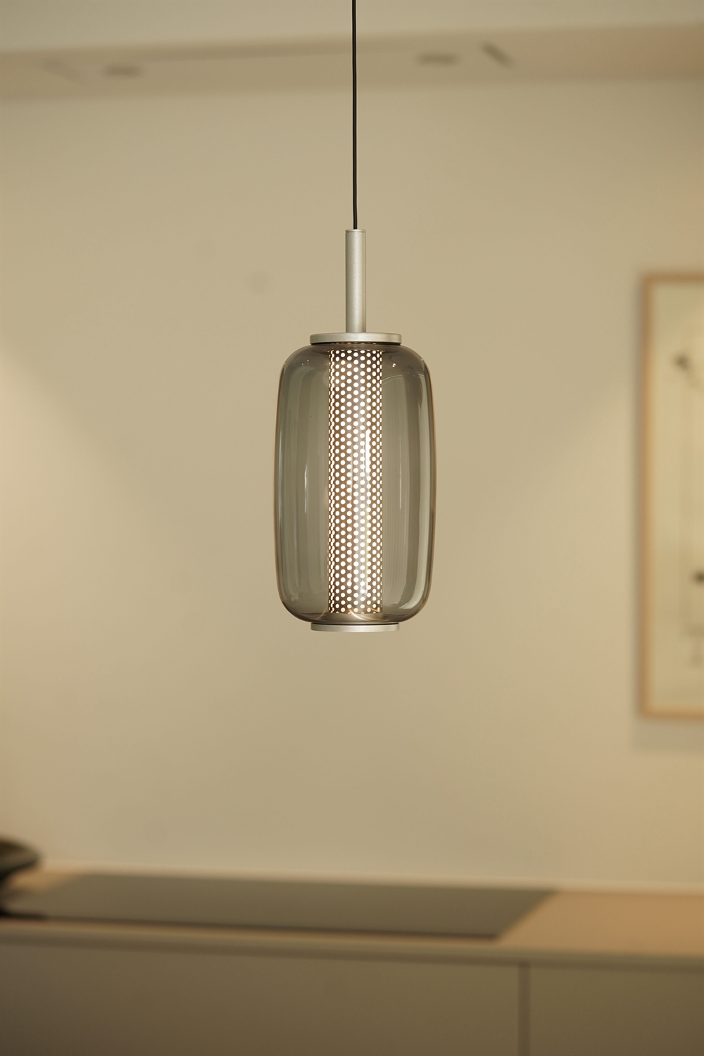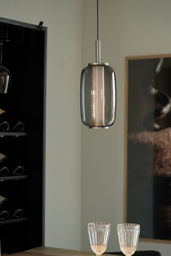 Die Pendelleuchte ist aus getöntem Glas und einem perforierten inneren Schirm gefertigt, der einen spannenden Kontrast im Design erzeugt. Der innere Schirm hilft dabei, das Licht zu formen, während der äußere Glasschirm der Leuchte einen eleganten und dekorativen Ausdruck verleiht. Eine gute Wahl als Beleuchtung über dem Esstisch oder einer Kücheninsel sowie als Stimmungsbeleuchtung in vielen Einrichtungen.