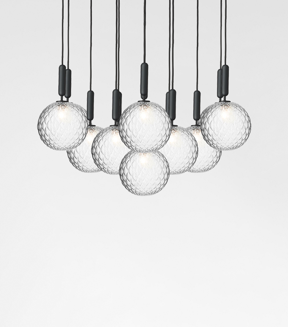 Miira Large ist eine Pendelleuchte mit mehr Gewicht - und sie schafft ein gutes Zusammenspiel mit der bestehenden Miira Pendelleuchte, die leichter im Ausdruck ist. Obwohl die neue Miira Large größer als die bestehende Miira-Kollektion ist, ermöglicht das minimalistische Design ein elegantes Erscheinungsbild. Das optische klare Glas mit dem einzigartigen geprägten Muster verleiht dem Raum eine außergewöhnliche Atmosphäre. Miira Large ergänzt die Miira-Kollektion und fügt Vielfalt und Dynamik hinzu.