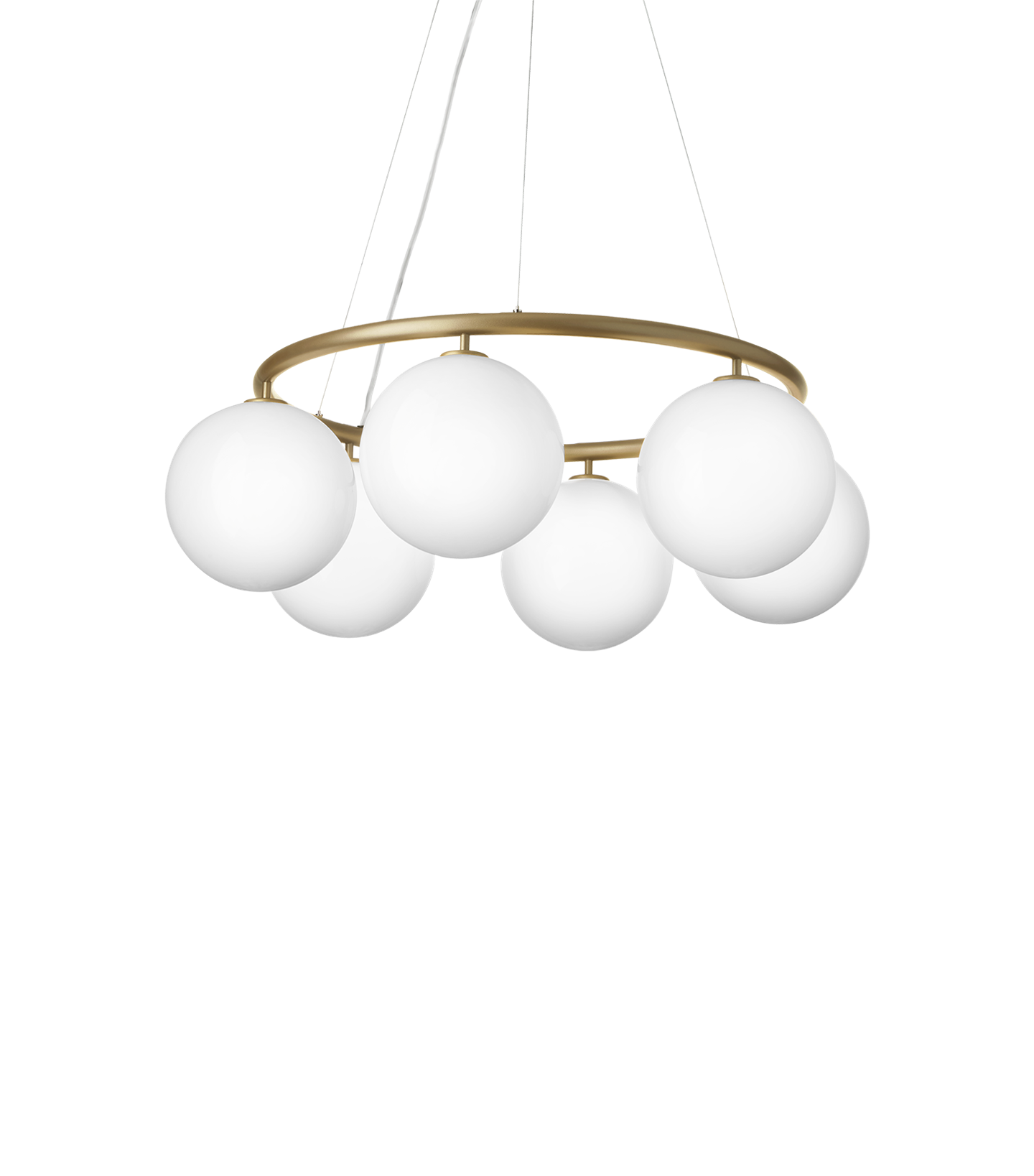 Der Miira 6 Circular mit sechs mundgeblasenen Glasglocken hat einen Durchmesser von 80 cm. Das macht den Kronleuchter unglaublich geeignet über einem Esstisch oder im Sofa-Bereich.