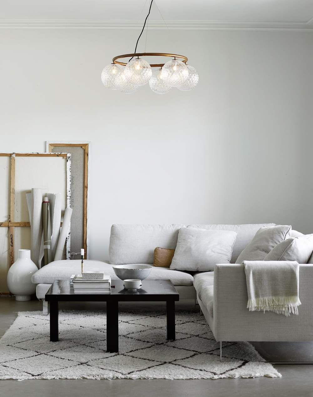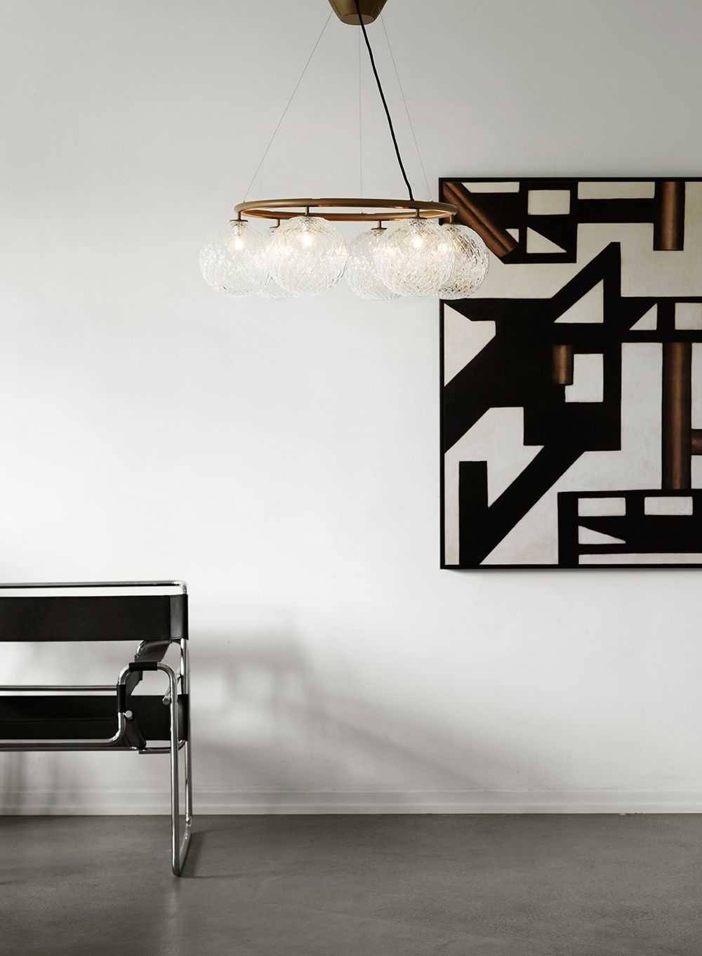 Miira 6 Circular, bestehend aus sechs mundgeblasenen Glasglocken, hat einen Durchmesser von 80 cm. Das macht den Kronleuchter unglaublich geeignet über einem Esstisch oder im Sofa-Bereich.