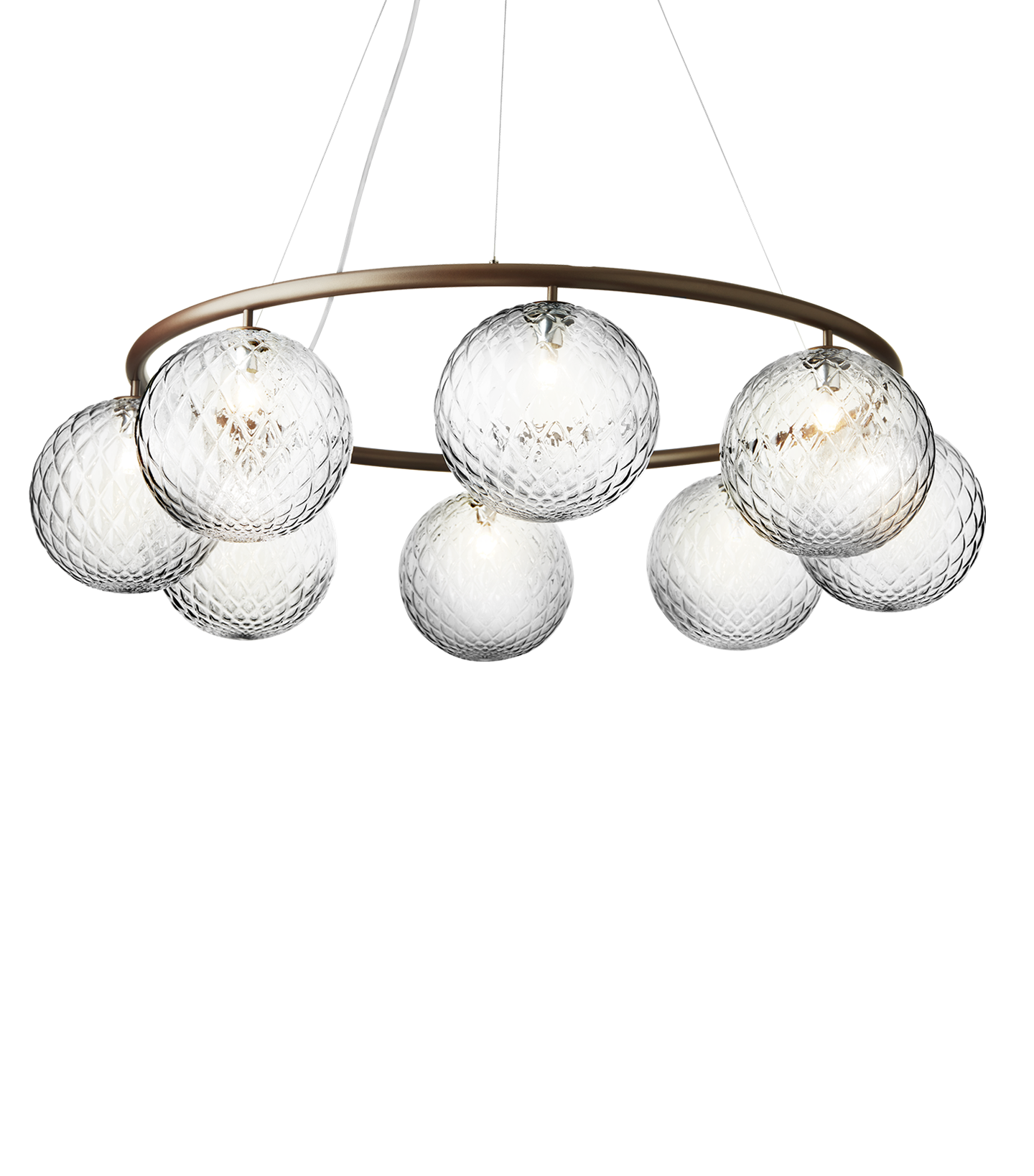 Miira 8 Circular mit acht Glaskugeln hat einen Durchmesser von 100 cm. Der größere Kronleuchter eignet sich besonders über dem großen Esstisch oder als schöne Beleuchtung im großen Eingangsbereich oder Flur.