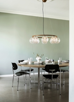 Die Miira-Kollektion von Nuura hat bereits Preise für ihr Design von Sofie Refer gewonnen und wird hier um einen runden Kronleuchter erweitert. Der Kronleuchter ist in zwei verschiedenen Größen erhältlich - mit 6 oder 8 mundgeblasenen Glaskugeln. Der Miira Circular Kronleuchter hat einen klassischen Ausdruck und ist so gestaltet, dass er sowohl niedrig als auch hoch von der Decke hängen kann. Die Höhe lässt sich einfach von 45 bis 250 cm mit dem speziellen Drahtsystem einstellen. Der Miira-Kronleuchter besteht aus einem pulverbeschichteten Metallring in einer neuen dunklen Bronze-Farbe. Von hier aus verbreiten die schönen mundgeblasenen Glaskugeln aus optischem Glas ein wunderschönes Licht. Die einfache und klassische Formgebung macht den Kronleuchter in vielen Einrichtungen äußerst vielseitig einsetzbar.