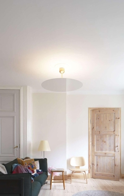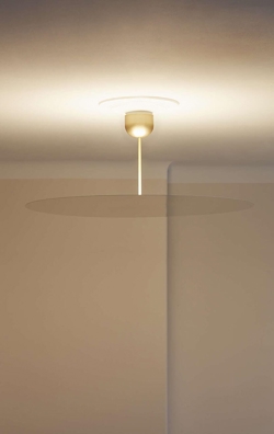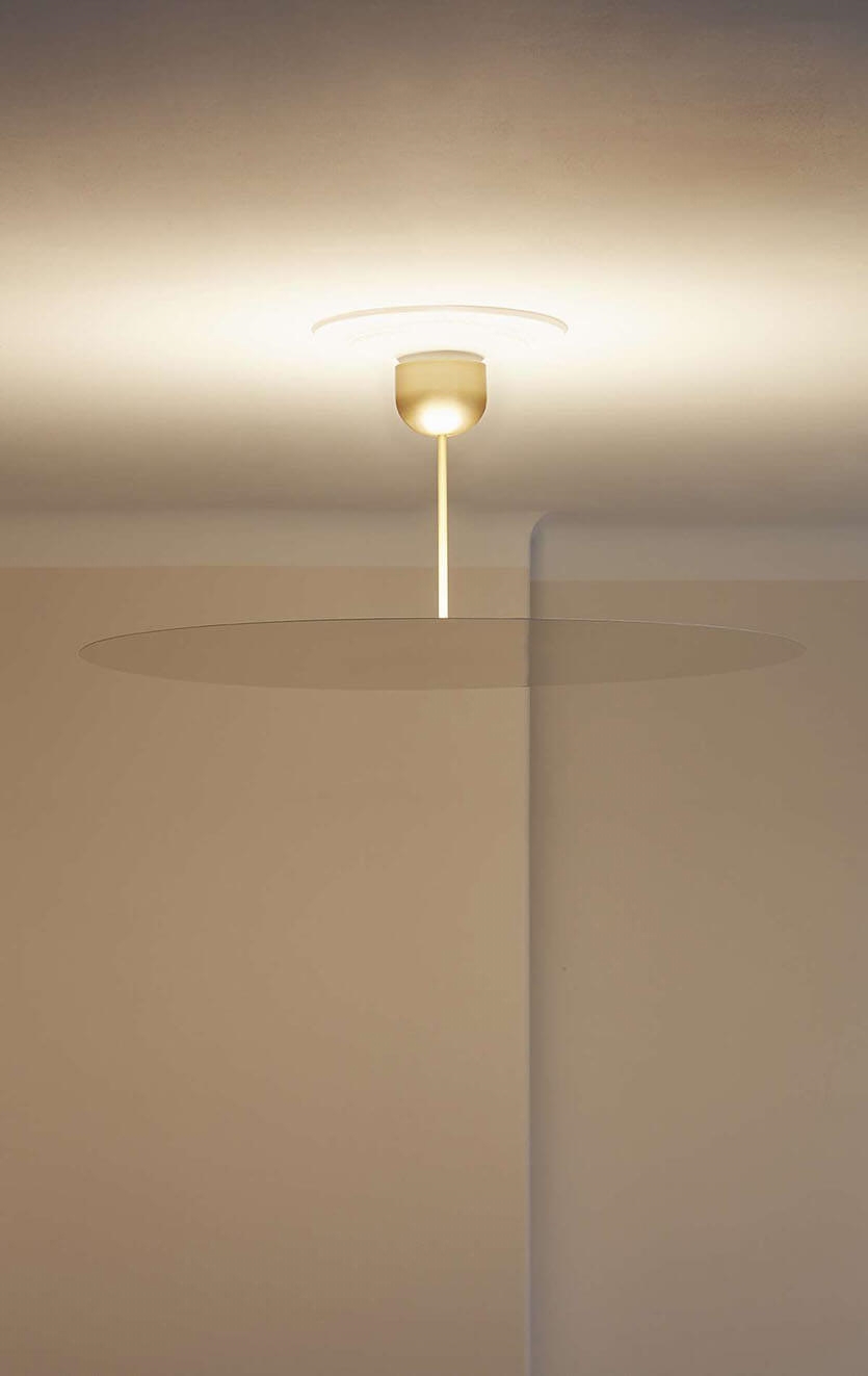 Millimetro ist mit seinem festen Stiel zwischen Decke und Schirm eine Mischung aus einer klassischen Deckenleuchte und einem Pendel. Der dünne Schirm mit Spiegeleffekt verbirgt die Lichtquelle, die ein gleichmäßiges, weiches Licht ausstrahlt.