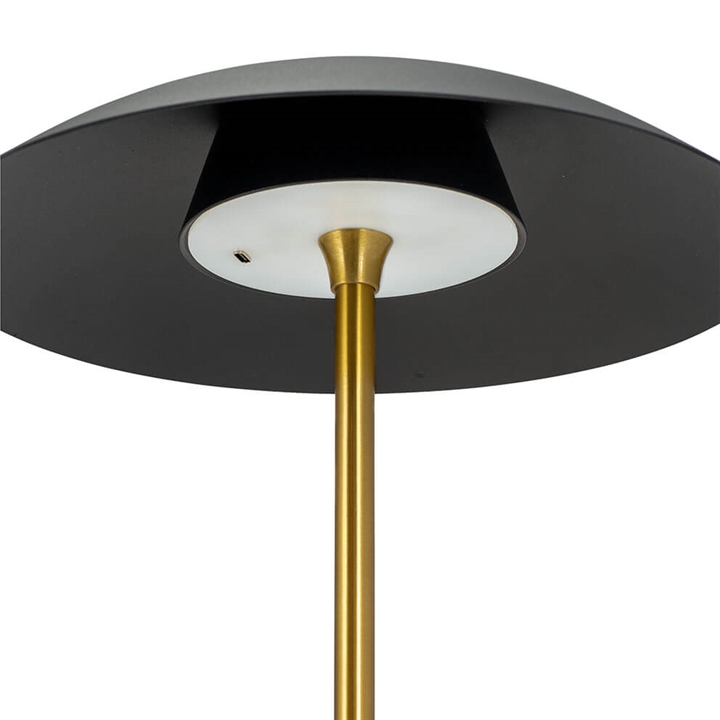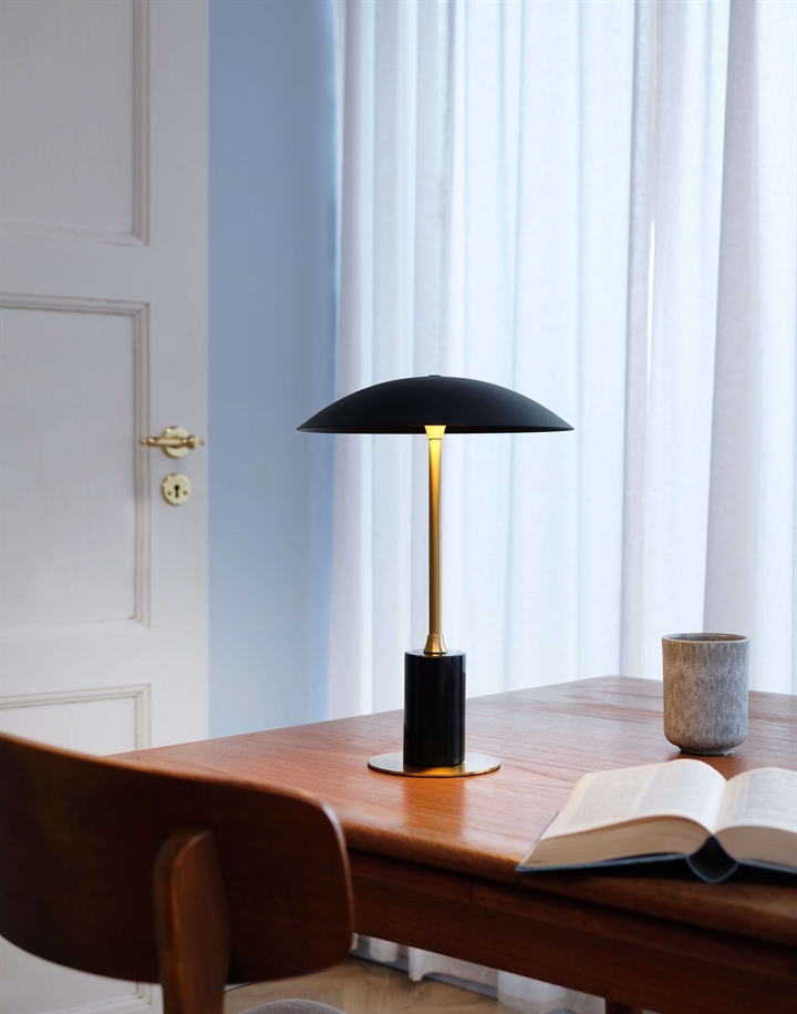 Die wiederaufladbare Tischlampe Moon ist kabellos und kann leicht bewegt werden, sodass das weiche und angenehme Licht überall in Ihrem Zuhause nach Bedarf verteilt werden kann. Mit ihrem schwarzen Metallschirm, dem Messinglampenstab und der Marmorbasis hat die Lampe ein elegantes skandinavisches Design, das sie ideal für die Platzierung auf dem Schreibtisch, im Wohnzimmer oder an einem anderen Ort macht, an dem eine Beleuchtung im einfachen Stil gewünscht wird.