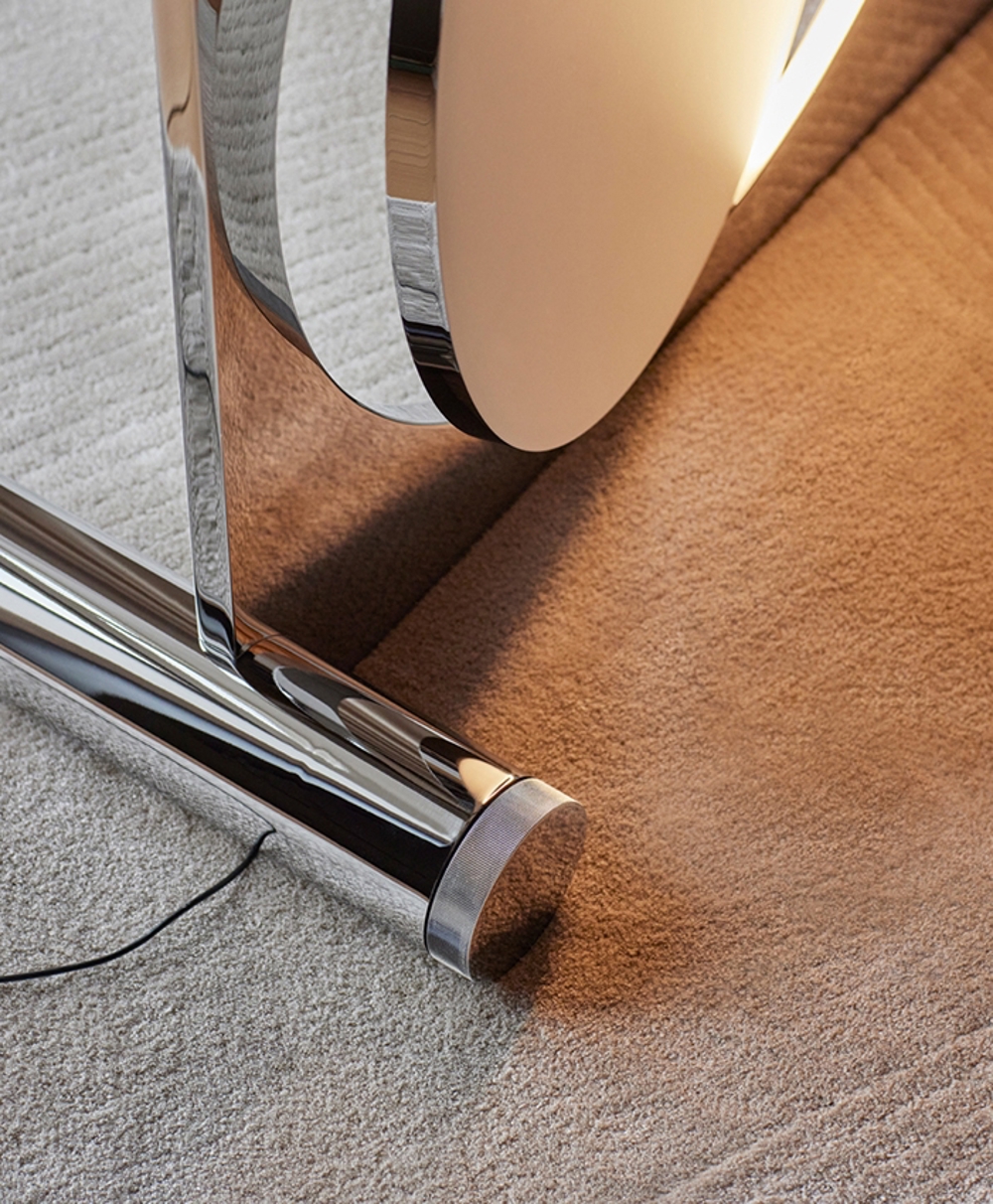 Die Stehleuchte besteht aus verchromtem Aluminium.