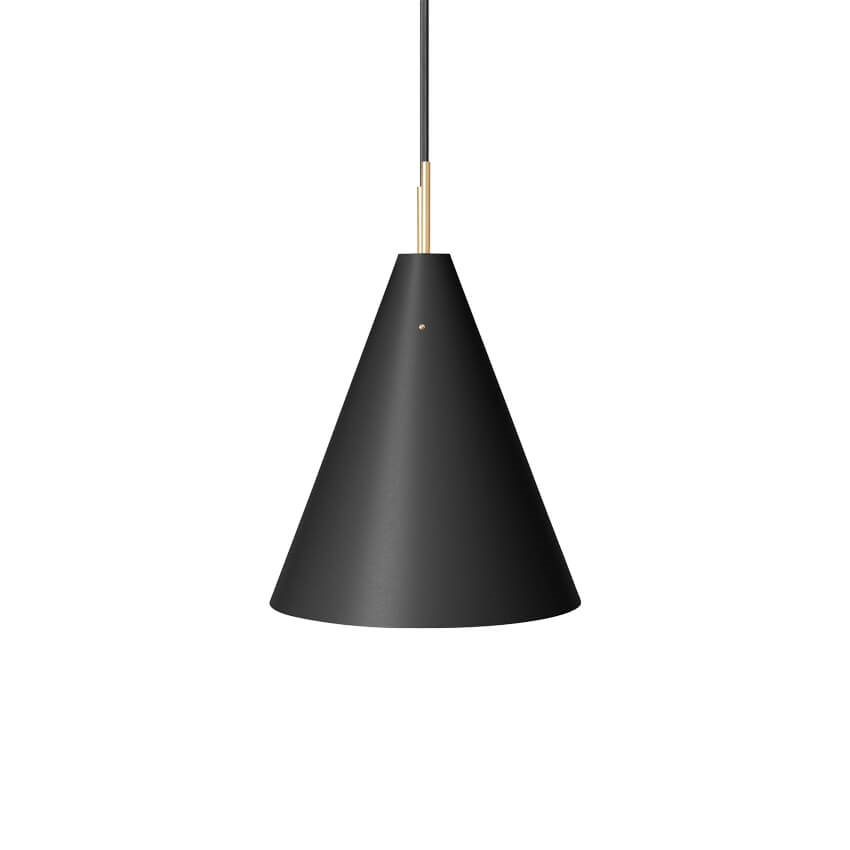Die Oberfläche des Lampenschirms besteht aus matt lackiertem Stahl, der schön mit Messingdetails kombiniert wird, die der Lampe Wärme verleihen. Die Kegelform des Schirms lenkt das Licht nach unten.