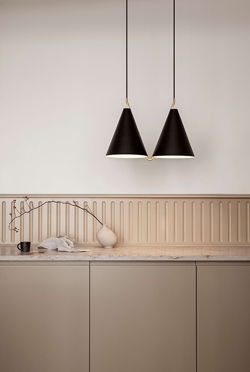 Die Oberfläche des Lampenschirms besteht aus matt lackiertem Stahl, der schön mit Messingdetails kombiniert wird, die der Lampe Wärme verleihen. Die beiden kegelförmigen Schirme lenken das Licht nach unten und bieten ein breites Lichtspektrum darunter.