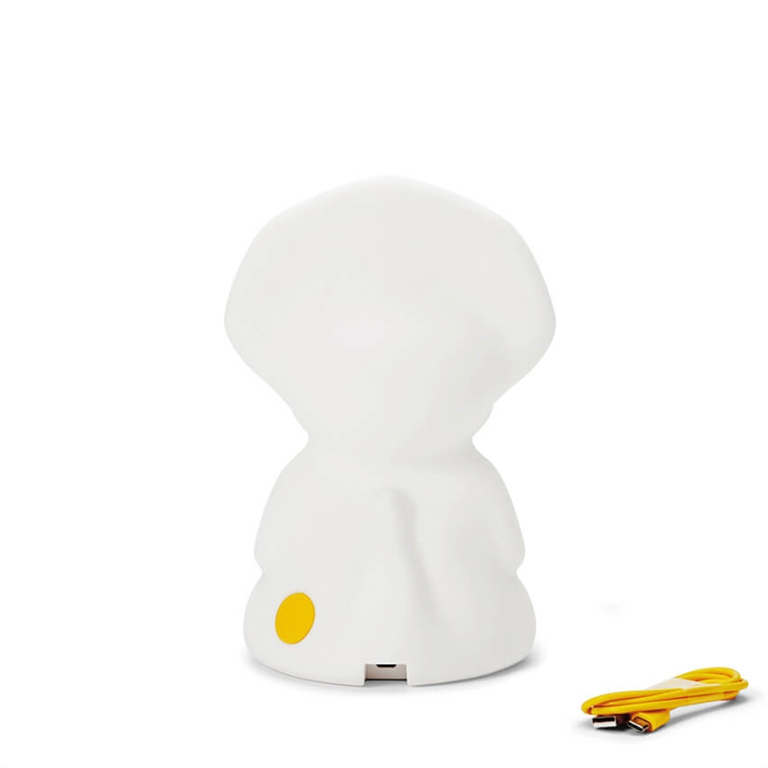 Ein/Aus-Schalter und Dimmknopf befinden sich am Boden des Dinosauriers. Mira besteht aus BPA-freiem Silikon.