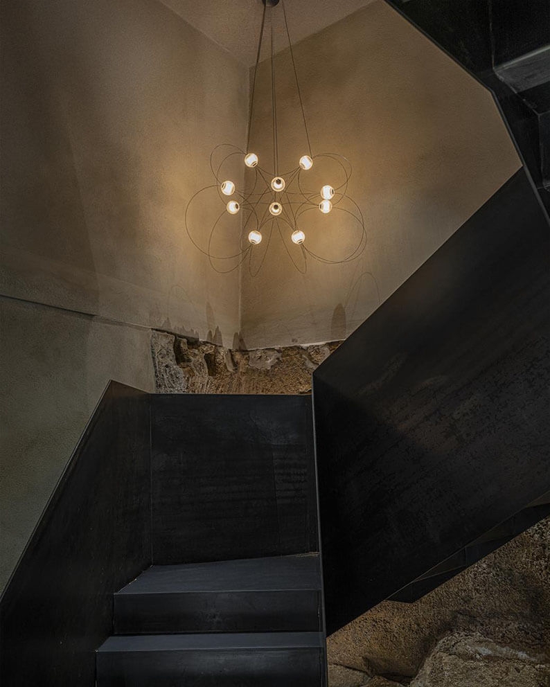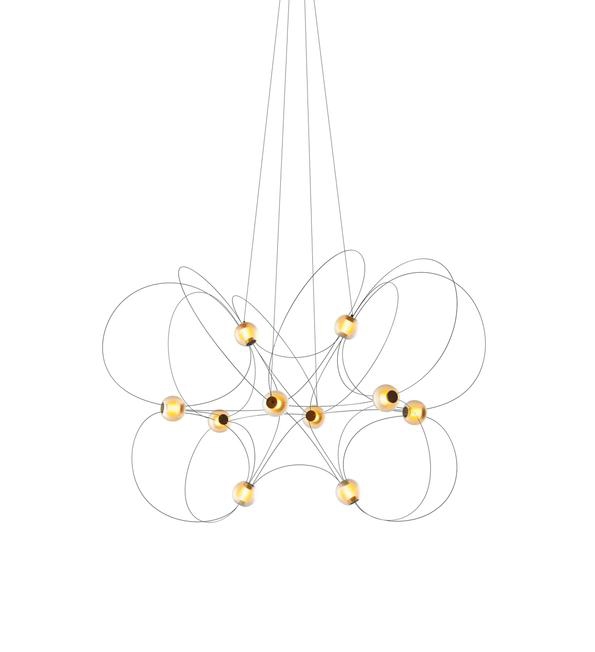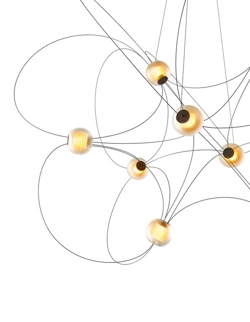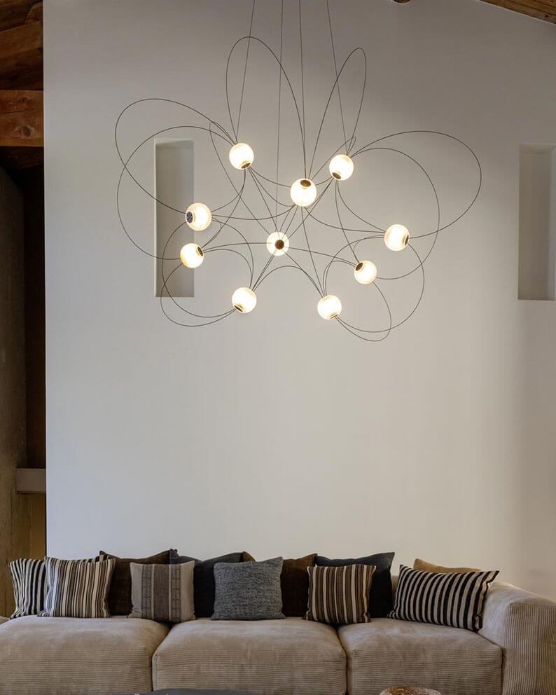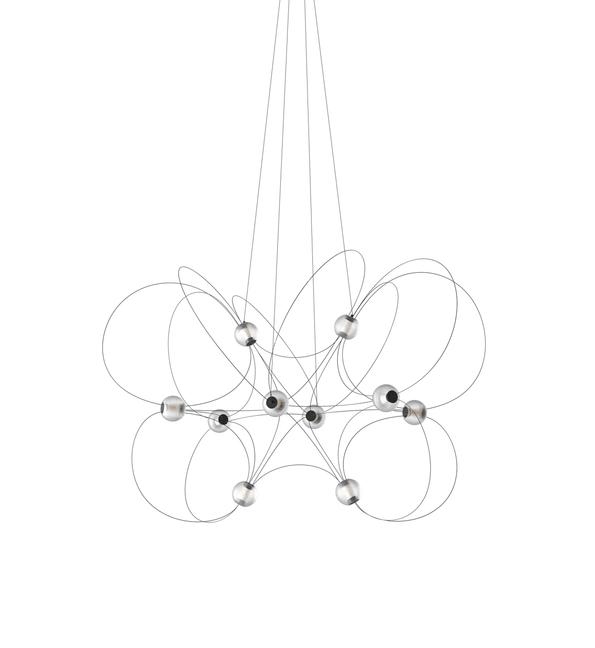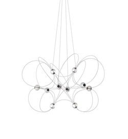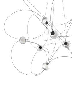 Der Kronleuchter Munari mit 10 Kugelschirmen ist eine skulpturale und grafische Ergänzung zur Einrichtung mit einem leichten und eleganten Design. Die Struktur mit einem Gleichgewicht zwischen schwarzen Stäben und leuchtenden Kugeln mit integrierten LED-Lichtquellen erinnert an eine Konstellation kosmischer Planeten, leuchtender Atome oder magnetischer Feldlinien.