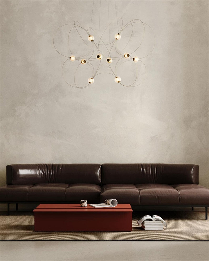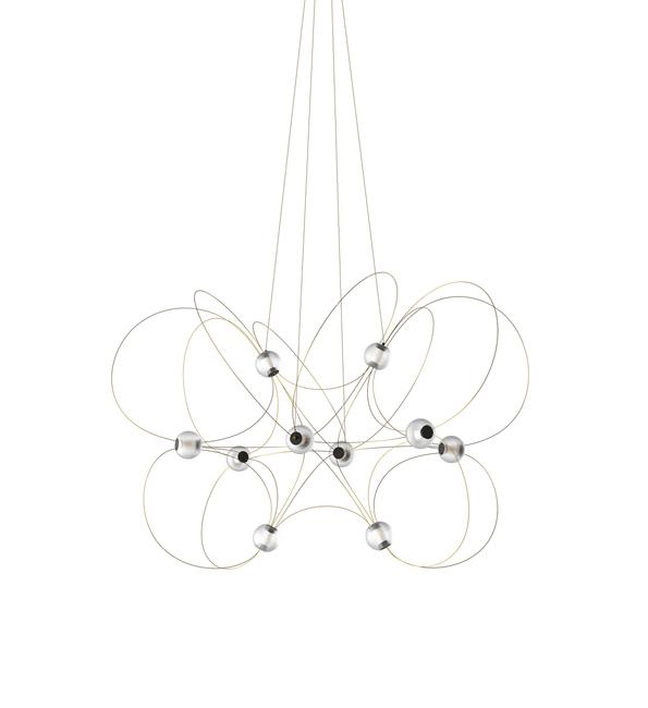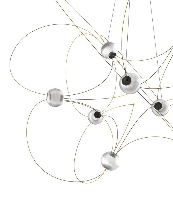 Der Kronleuchter Munari mit 10 Kugelschirmen ist eine skulpturale und grafische Ergänzung zur Einrichtung mit einem leichten und eleganten Design. Die Struktur mit einem Gleichgewicht zwischen Stäben mit Goldfinish und leuchtenden Kugeln mit integrierten LED-Lichtquellen erinnert an eine Konstellation kosmischer Planeten, leuchtender Atome oder magnetischer Feldlinien.