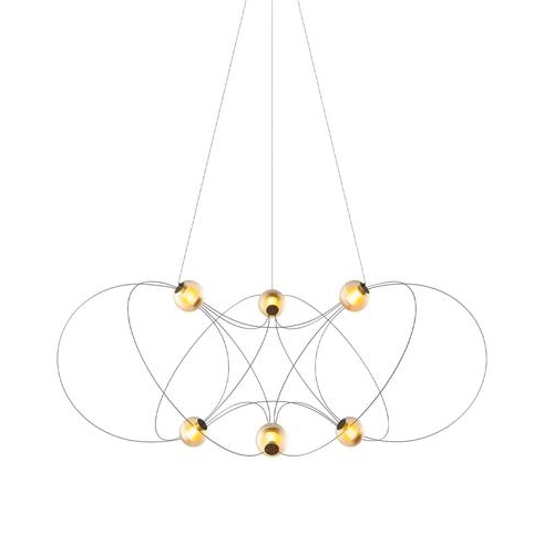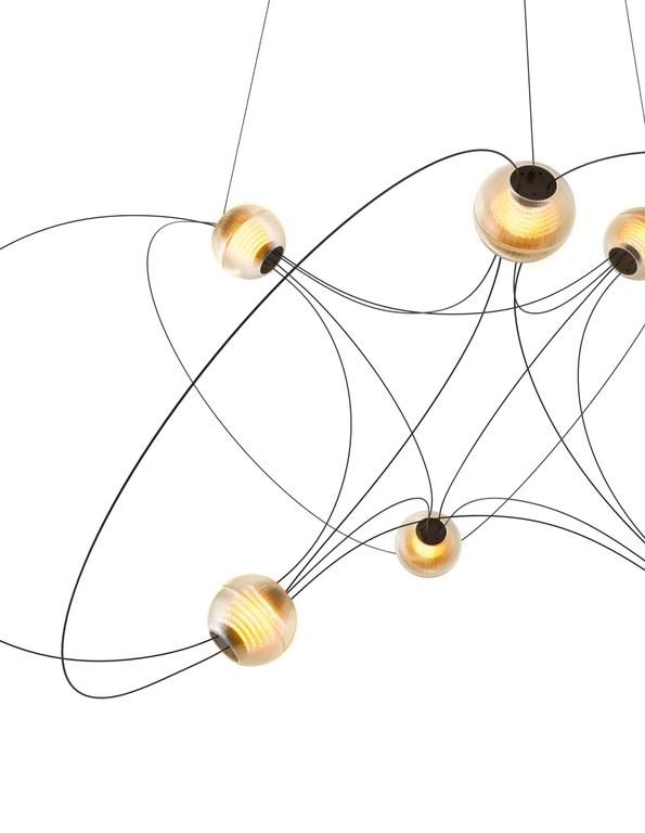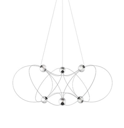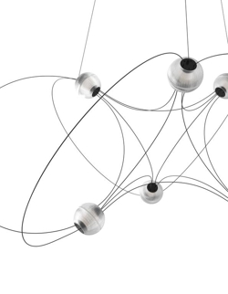 Der Kronleuchter Munari mit 6 Kugelschirmen ist eine skulpturale und grafische Ergänzung zur Einrichtung mit einem leichten und eleganten Design. Die Struktur mit einem Gleichgewicht zwischen schwarzen Stäben und leuchtenden Kugeln mit integrierten LED-Lichtquellen erinnert an eine Konstellation kosmischer Planeten, leuchtender Atome oder magnetischer Feldlinien.