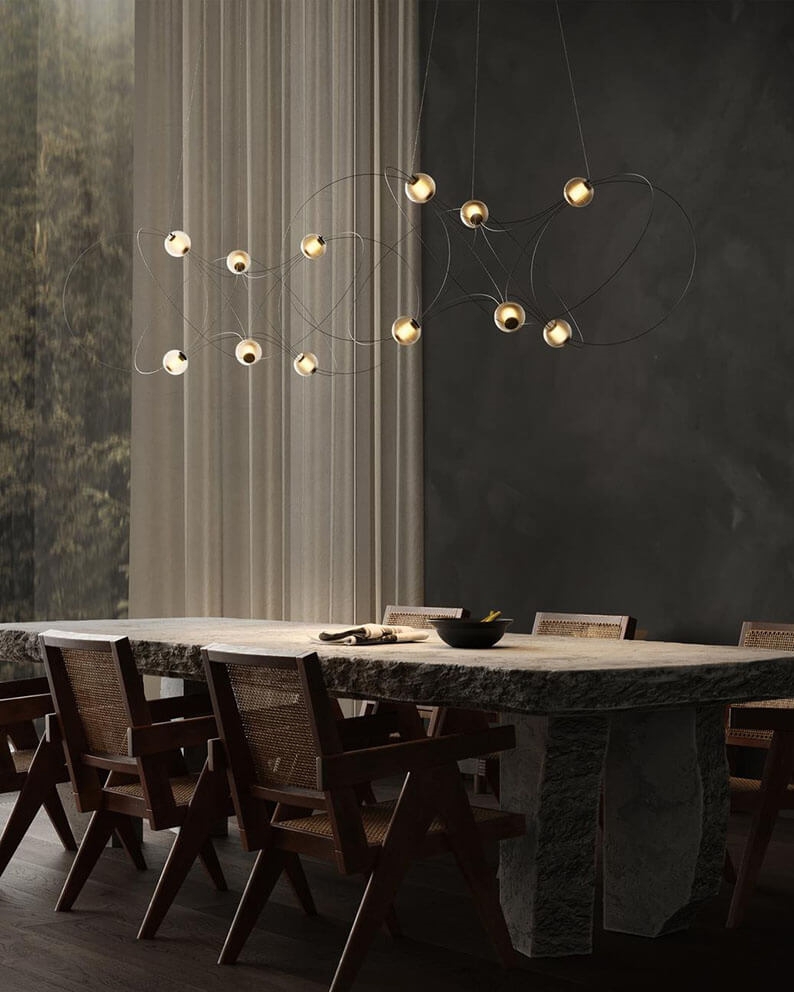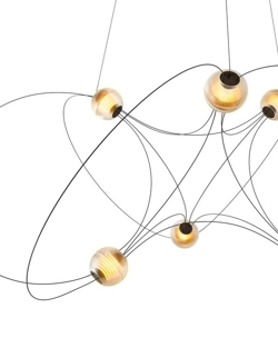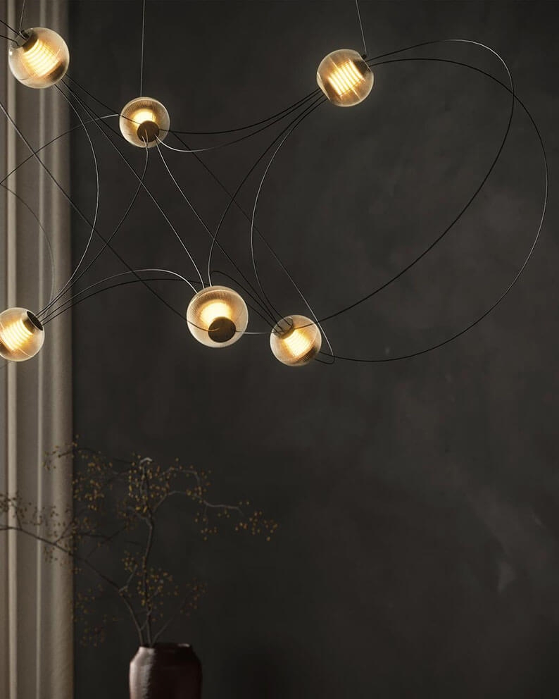Munari strahlt ein kraftvolles, aber traumhaftes Licht aus und ist mit 6, 8 oder 10 Kugelschirmen und einer Struktur in Schwarz oder Gold erhältlich. Eine offensichtliche Wahl für das Wohnzimmer und das Esszimmer oder einen Flur mit hoher Decke.