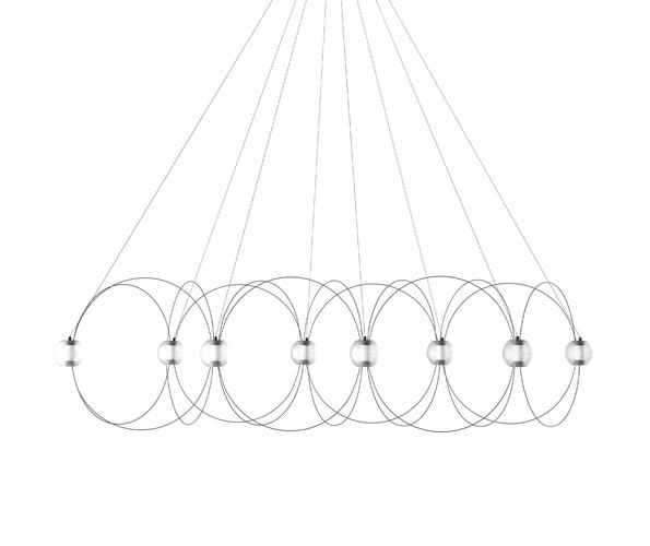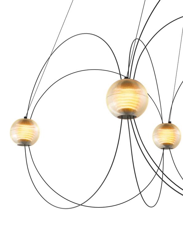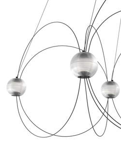 Der Kronleuchter Munari mit 8 Kugelschirmen ist eine skulpturale und grafische Ergänzung zur Einrichtung mit einem leichten und eleganten Design. Die Struktur mit einem Gleichgewicht zwischen schwarzen Stäben und leuchtenden Kugeln mit integrierten LED-Lichtquellen erinnert an eine Konstellation kosmischer Planeten, leuchtender Atome oder magnetischer Feldlinien.