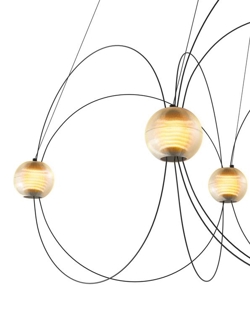 Munari strahlt ein kraftvolles, aber traumhaftes Licht aus und ist mit 6, 8 oder 10 Kugelschirmen und einer Struktur in Schwarz oder Gold erhältlich. Eine offensichtliche Wahl für das Wohnzimmer, Esszimmer oder einen Flur mit hoher Decke.