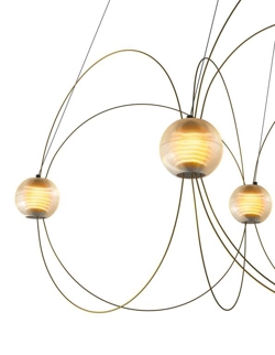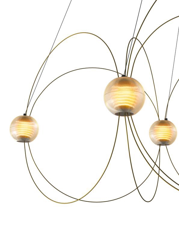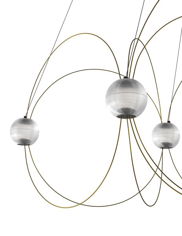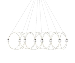 Der Kronleuchter Munari mit 8 Kugelschirmen ist eine skulpturale und grafische Ergänzung zur Einrichtung mit einem leichten und eleganten Design. Die Struktur mit einem Gleichgewicht zwischen Stäben mit Goldfinish und leuchtenden Kugeln mit integrierten LED-Lichtquellen erinnert an eine Konstellation kosmischer Planeten, leuchtender Atome oder magnetischer Feldlinien.