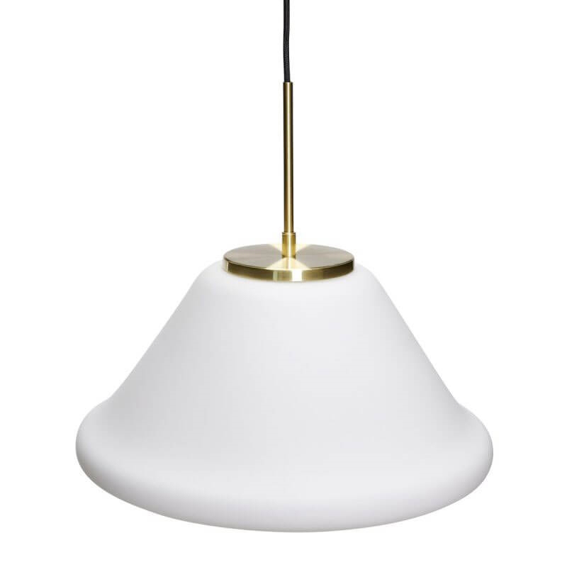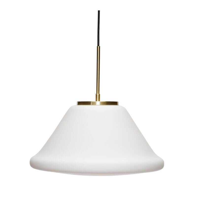 Muse mit der dreieckigen Form ist eine elegante und einfache Pendelleuchte, die aus einem Schirm aus zeitlosem weißem Opalglas besteht. Aufgrund des Schirms erscheint das Licht angenehm im Raum. Die Messingoberseite der Pendelleuchte verleiht ihr einen femininen Ausdruck und sie wird über dem Esstisch sowohl in modernen als auch in traditionellen Einrichtungen schön aussehen.