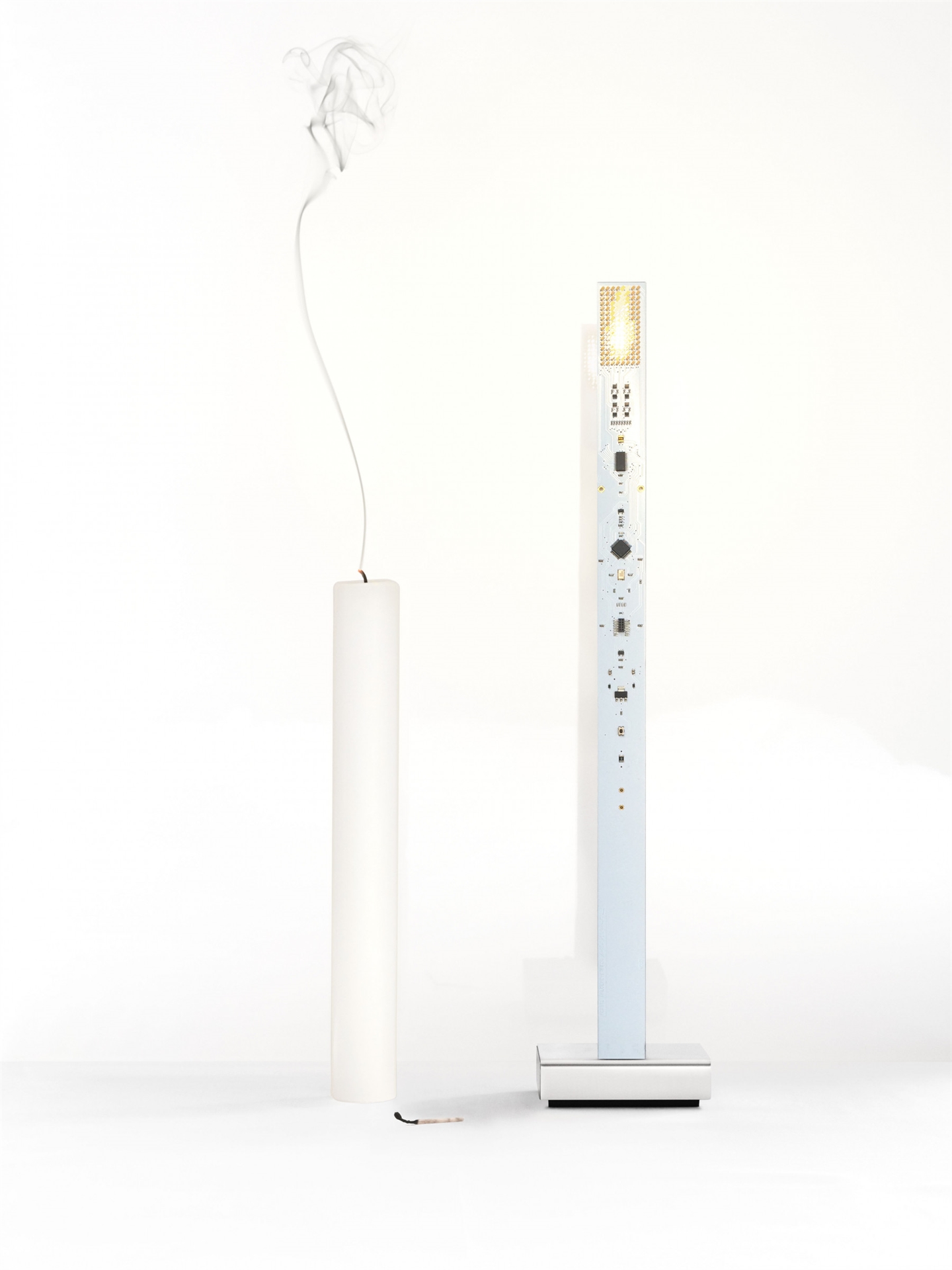 Ingo Maurer My New Flame Tischlampe ist aus Leiterplatte, Metall und Kunststoff gefertigt. Basierend auf Videomaterial reproduzieren die LEDs eine flackernde Kerzenflamme auf realistische und fesselnde Weise. Es gibt einen Ein-/Ausschalter in der Bodenplatte und ein schwarzes USB-Kabel (150 cm)