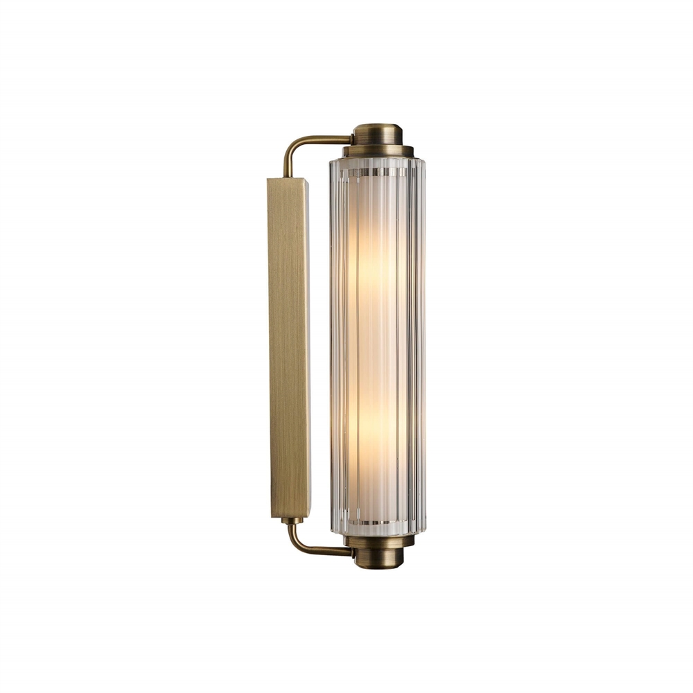 Die Wandleuchte Nimal Double mit Messing-Finish ist dank ihrer IP44-Klassifizierung ideal für Badezimmer und andere Innenräume geeignet. Nutzen Sie die elegante Lampe über oder neben einem Spiegel, wo das Design im Art Deco-Stil mit einem schönen geriffelten Schirm sowohl dekorativ ist als auch für angenehmes Licht sorgt.
