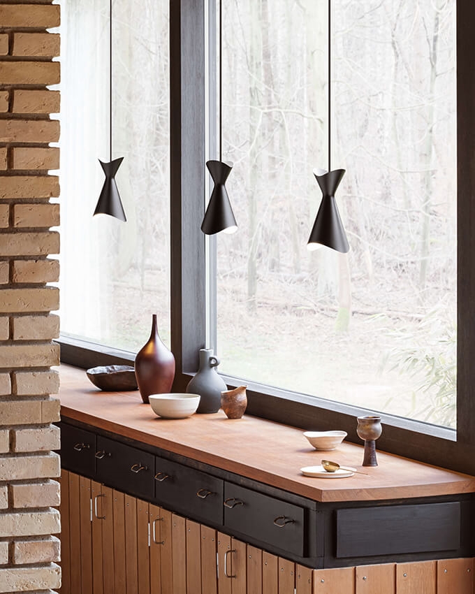 Die Form der Ninotchka Pendelleuchte wurde von Bent Karlby entworfen, der sich von der schwedischen Hollywood-Diva Greta Garbo inspirieren ließ, die in einem Film von 1939 einen auffälligen Hut trug. Die Form des Hutes diente als Inspiration für das Design der Leuchte.