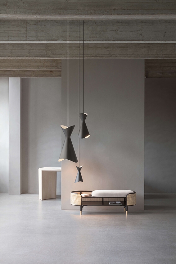 Die Form der Ninotchka Pendelleuchte wurde von Bent Karlby entworfen, der sich von der schwedischen Hollywood-Diva Greta Garbo inspirieren ließ, die in einem Film von 1939 einen auffälligen Hut trug. Die Form des Hutes diente als Inspiration für das Design der Leuchte.