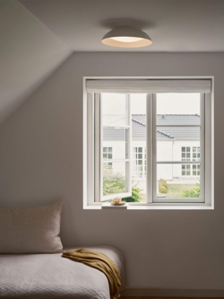 Nivora 38 mit E27-Fassung kann als Deckenleuchte oder Wandleuchte undhat einen breiten, gebogenen Schirm mit einer mattweißen Oberfläche. Das Design sorgt für ein gleichmäßiges und angenehmes, blendfreies Licht in der Umgebung und macht die Leuchte ideal für das Wohnzimmer, Schlafzimmer oder den Eingangsbereich.