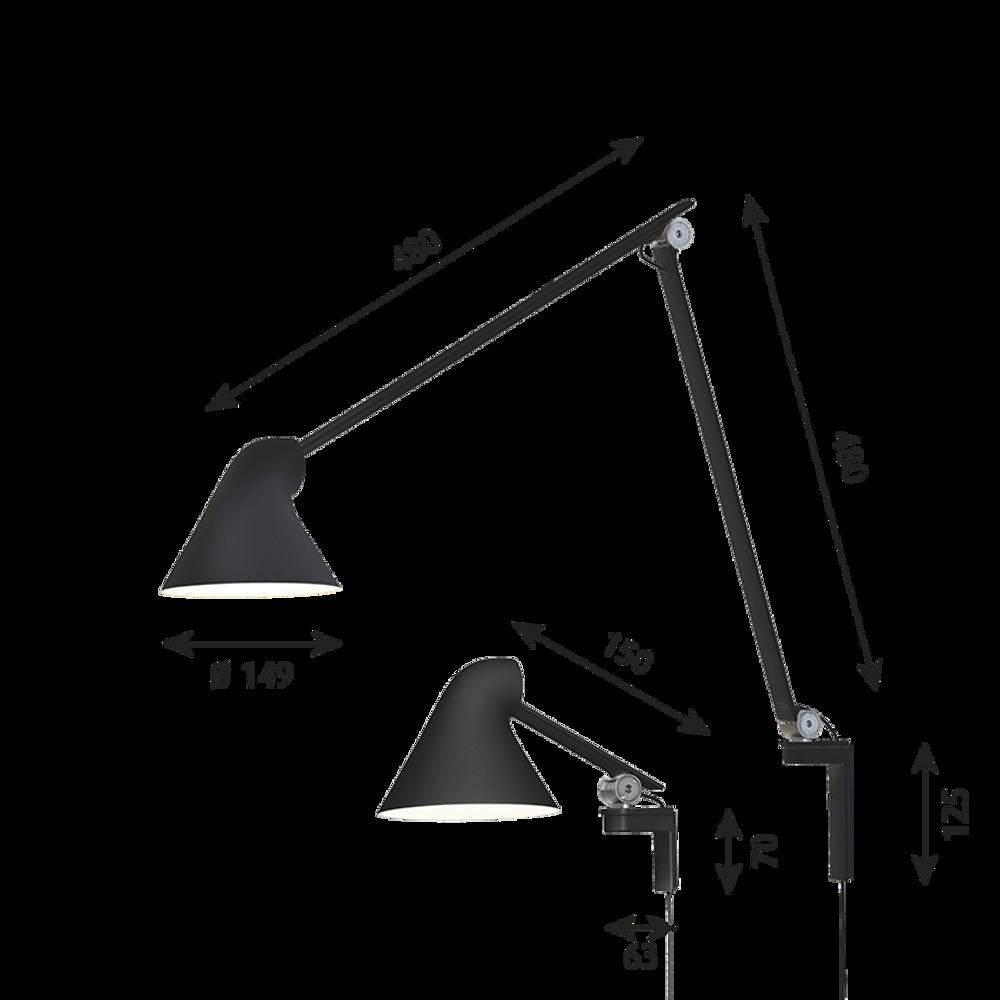Die NJP Lampenserie besteht aus Stehleuchten, Wandleuchten mit kurzem oder langem Arm und als Tischleuchte in vielen Varianten in Schwarz, Weiß und hellem Alugrau.